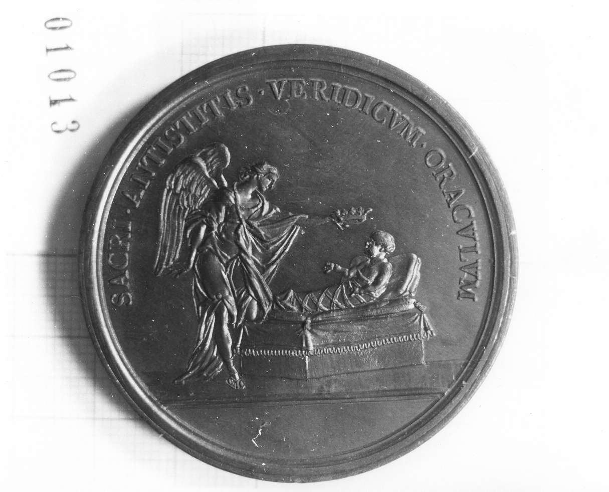 Dritto: Busto feminile a sinistra, testa di profilo con cuffia ricamata sopra i capelli, veste ornata, collo alto, colletto ondlato, collana con pendente, mantello sulle spalle. Rovescio: Un angelo in piedi a sinistra avvicina una corona ad un bambino fasciato sdraiato su un letto con coltre ricamata. In ricordo della benedizione del Vaticinio di Sant'Anselmo di Belley morente (26 VI 1177), egli predisse ad Umberto III la nascita dell'erede maschio