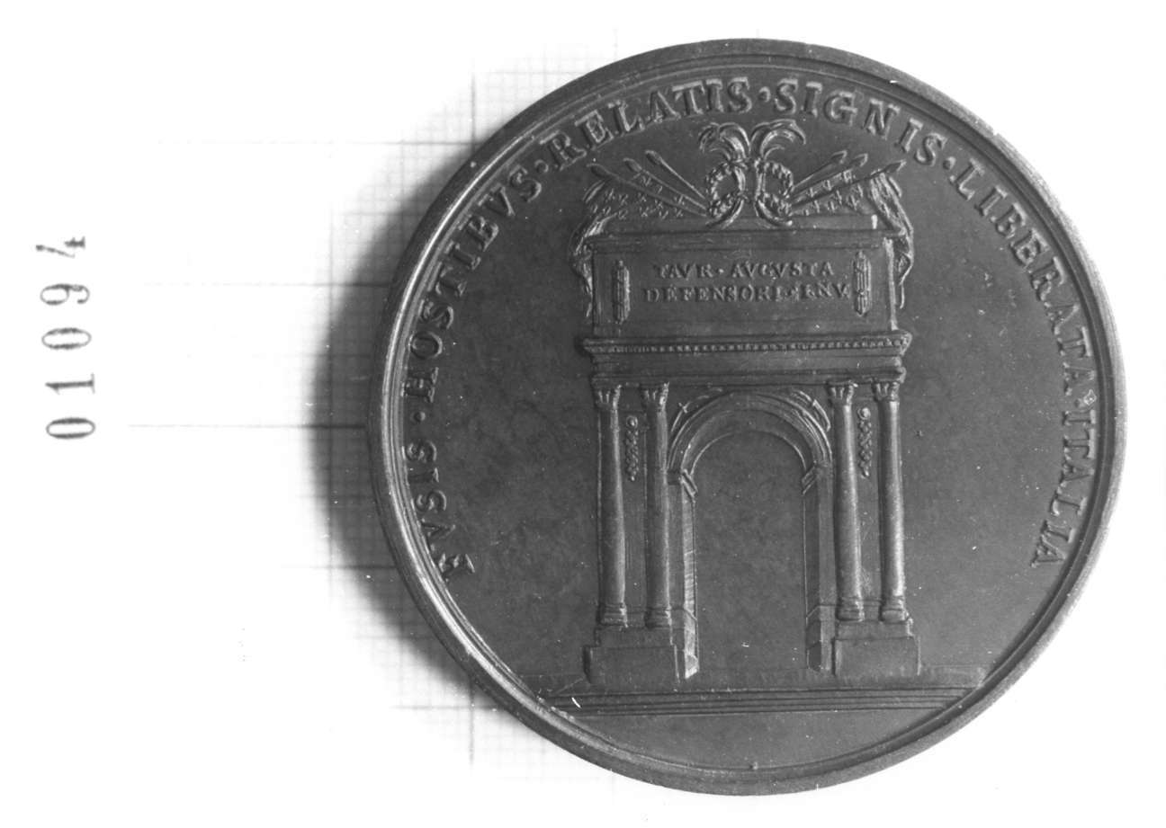 Dritto: Busto virile armato a destra, parrucca con lunghi capelli sulle spalle, colletrto annodato, collo con orlo perlinato, collare dell'Annunziata sul petto; mantello foderato di pelliccia sulle spalle. Rovescio: Arco di trionfo per la vittoria sui francesi e la fine dell'assedio di Torino nel 1706