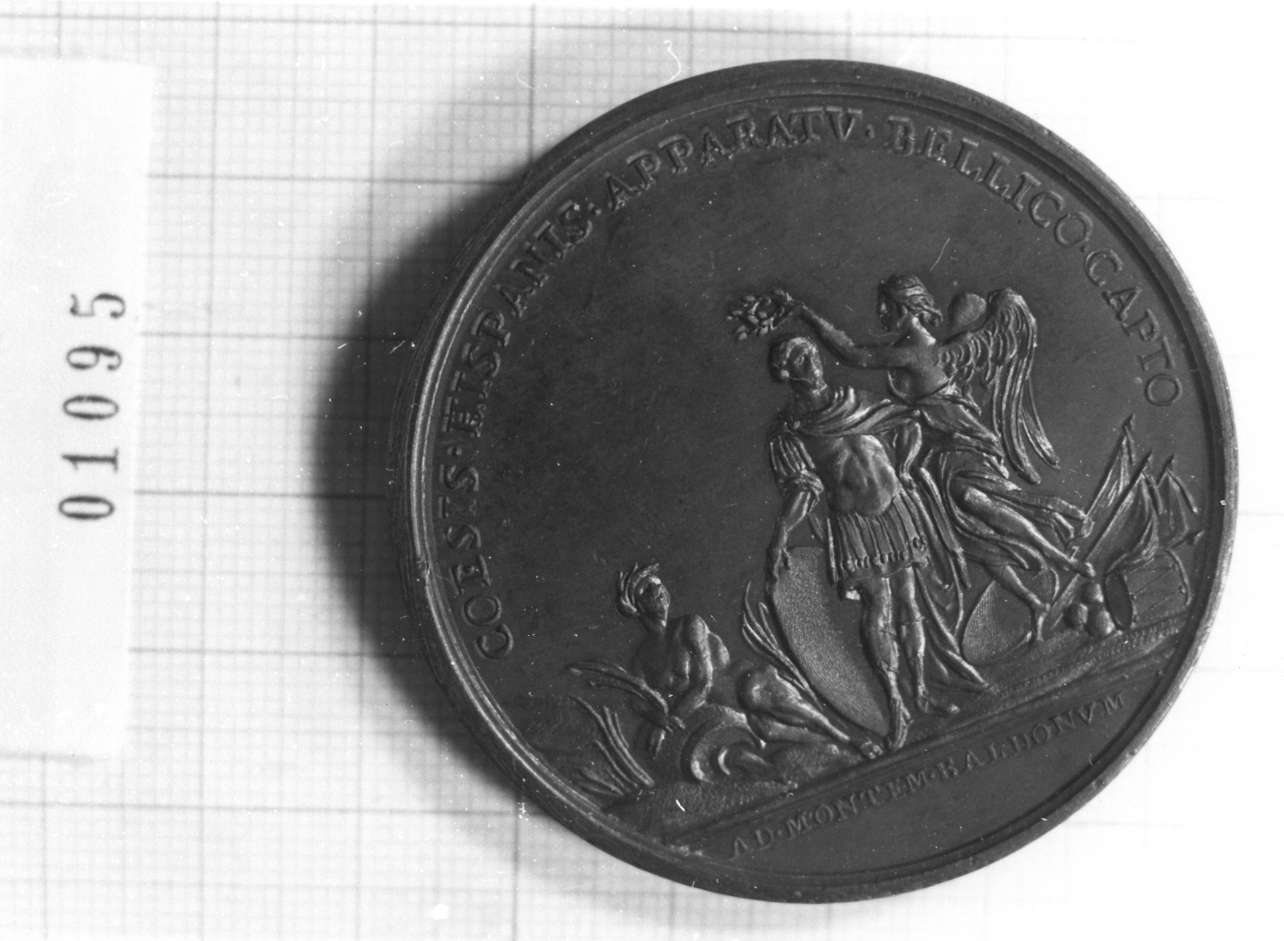 Dritto: Busto virile a destra armato, capelli ondulati, baffi e pizzo, ampio colletto ornato a fiorellini, nodi sabaudi e bordo festonato sopra armatura con croce di Savoia in petto, spallaccio conj bordo bullettato, collare dell'Annunziata. Rovescio: Duca armato all'antica stante coronato dalla Vittoria, in fondo a destra trofeo d0armi, a sinistra figura giacente con vaso
