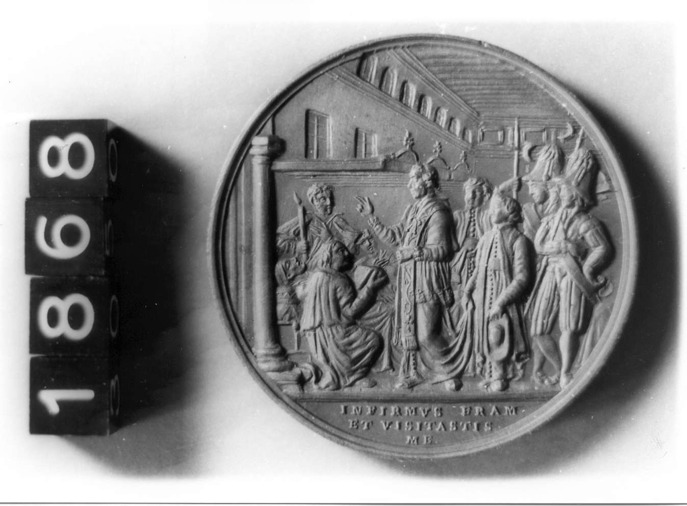Dritto: Busto a sinistra con berrettino e piviale. Rovescio: Visita del Papa agli infermi, accompagnato da suo seguito di svizzeri a destra, un morente nel letto a sinistra e con altre figure e una fila di baldacchini; a sinistra, nell'ampio stanzone illuminato da finestre con il soffitto di travi a vista