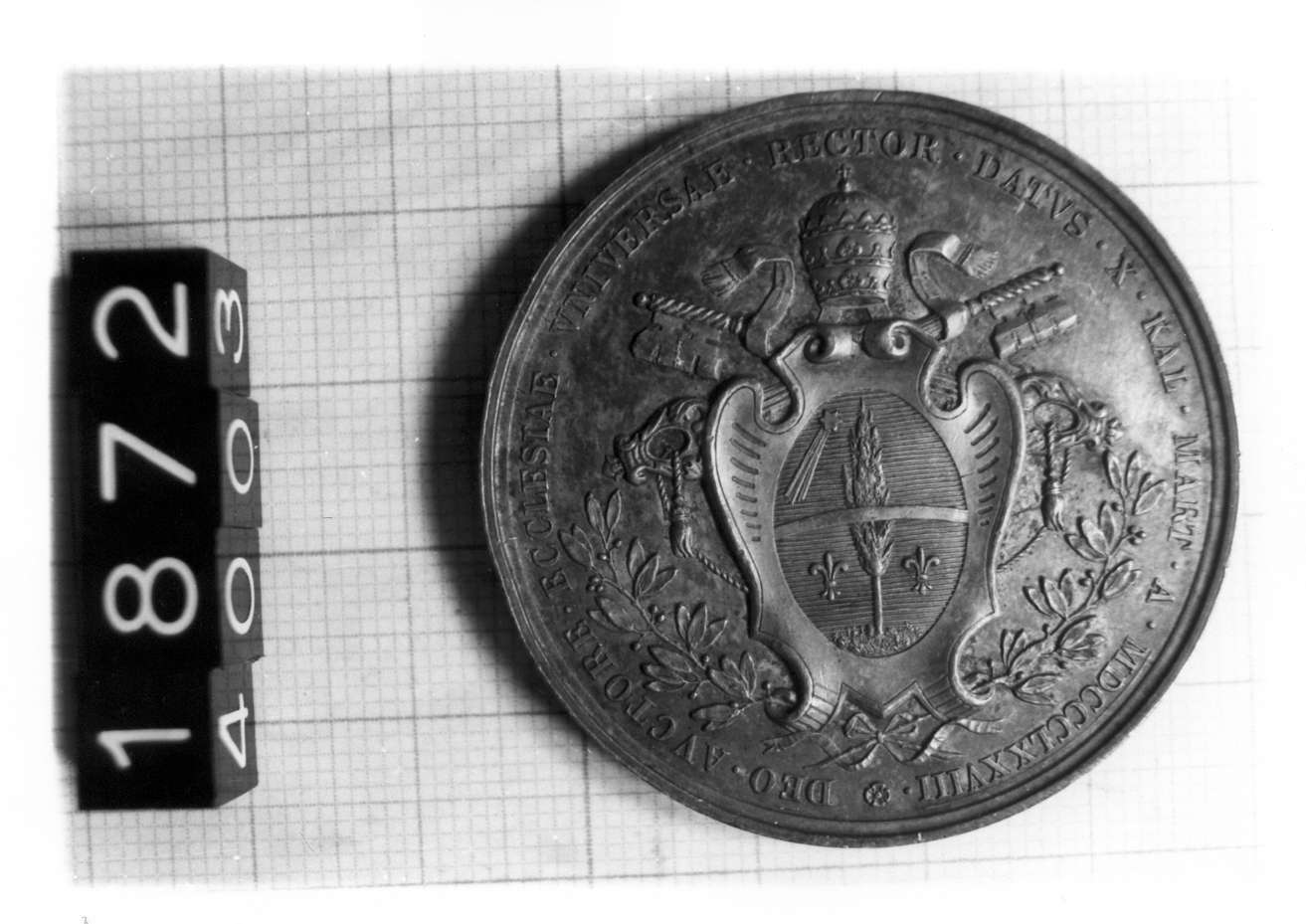 Dritto: Busto a sinistra con berrettino, mozzetta e stola con fascia ricamata con la colomba raggiante, orlo di pelliccia, campo liscio. Rovescio: Stemma Pecci con tiara e chiavi fra due rami di quercia annodati