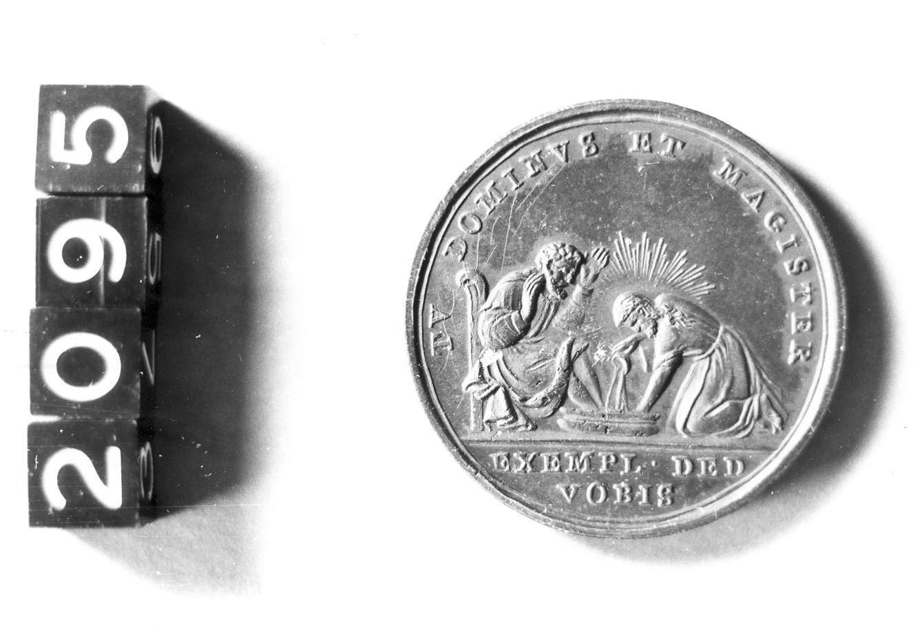 Dritto: Busto a sinistra con berrettino, mozzetta e stola. Rovescio: Cristo radiato inginocchiato a destra lava i piedi a S. Pietro seduto a sinistra con le mani alzate insegno di stupore