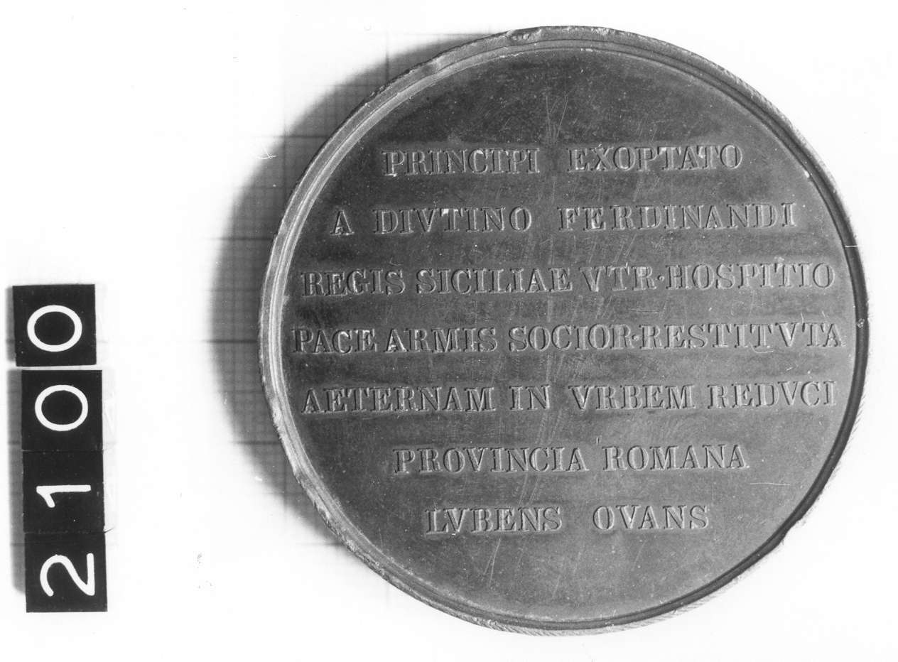 Dritto: Busto a destra con berrettino, mozzetta e stola ricamata con racemi, tiara e triangolo raggiante. Rovescio: Epigrafia in campo liscio