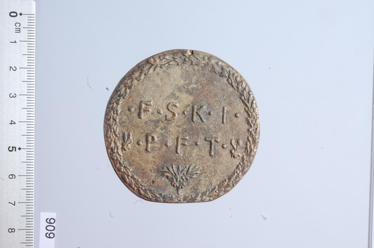 Dritto: Busto di profilo di Pisanello verso sinistra; indossa un elegante abito in broccato e un alto copricapo floscio con risvolto. Rovescio: Entro una ghirlanda d'alloro le iniziali delle tre virtù teologali e delle quattro cardinali e un ramo d'alloro in basso