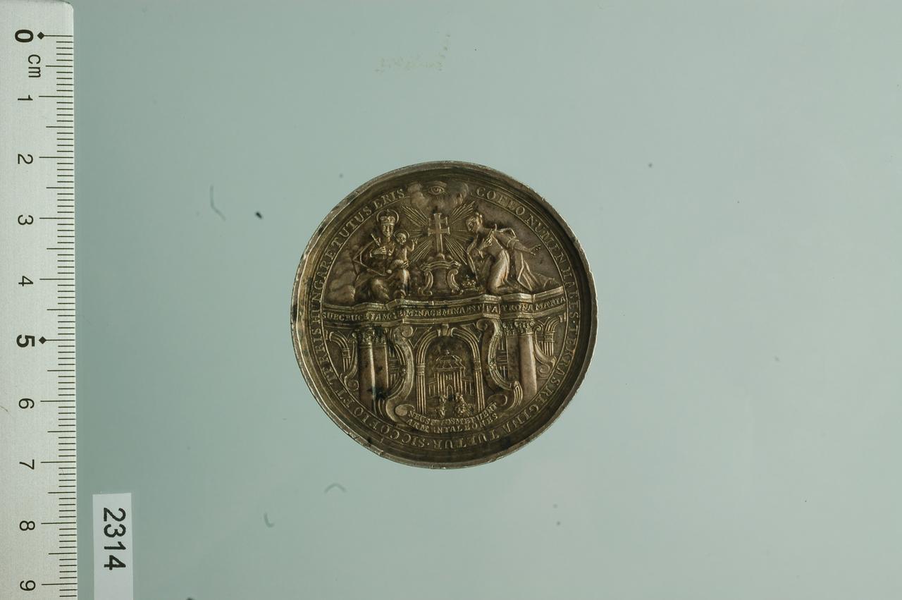 Dritto: Stemma nobiliare con drappo sullo sfondo. Rovescio: Padiglione barocco sovrastato dalla Madonna col Bambino a sinistra e Sant'Elisabetta a destra della croce centrale. Sopra la croce occhio tra le nubi