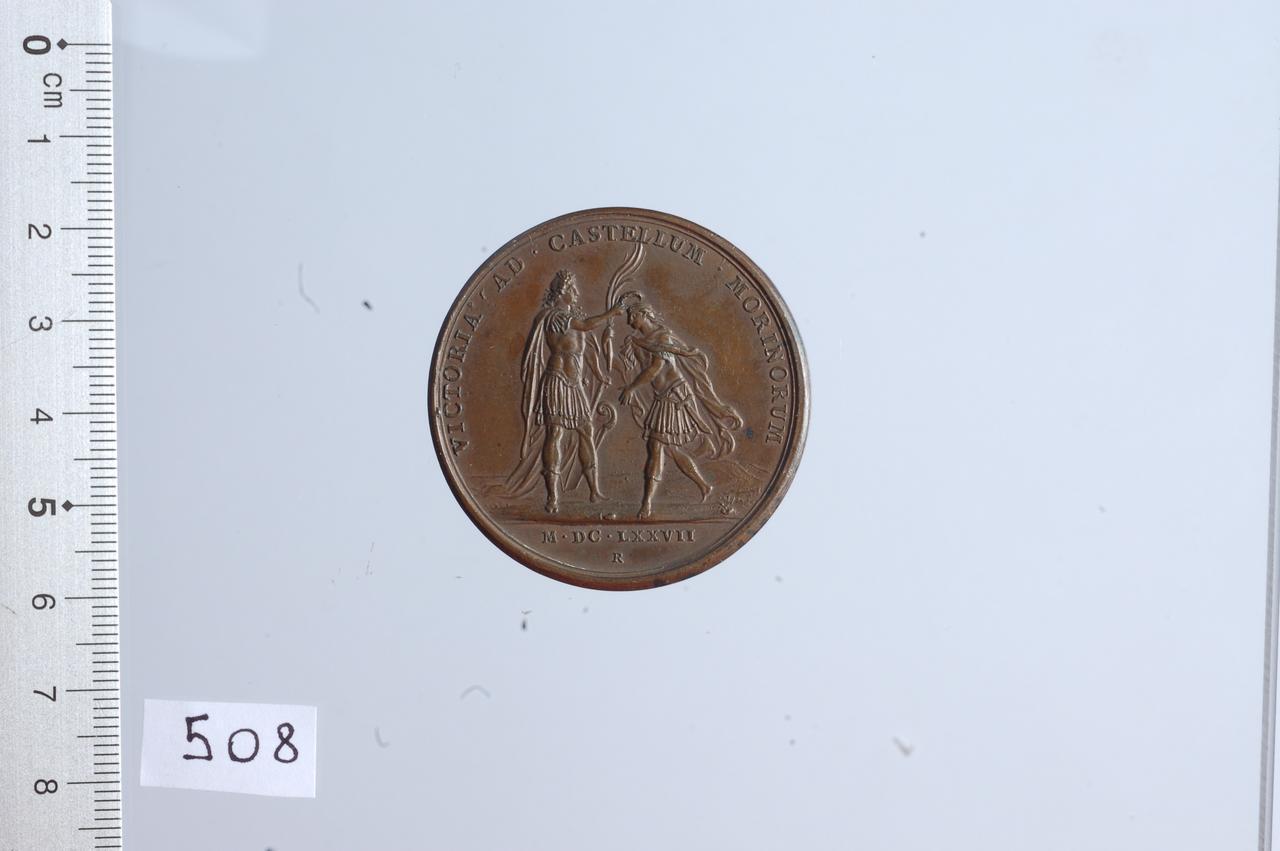 Dritto: Luigi XIV, a destra di profilo, con parrucca. Rovescio: Il re in costume romano antico incorona il duca d'Orleans