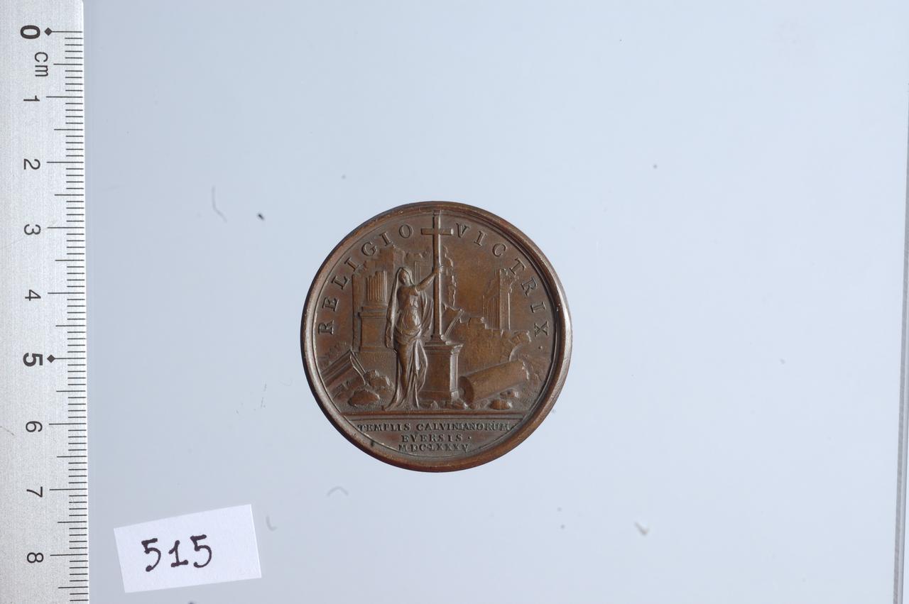 Dritto: Luigi XIV, a destra di profilo, con parrucca. Rovescio: La Religione pianta una croce sulle rovine di un tempio calvinista abbattuto