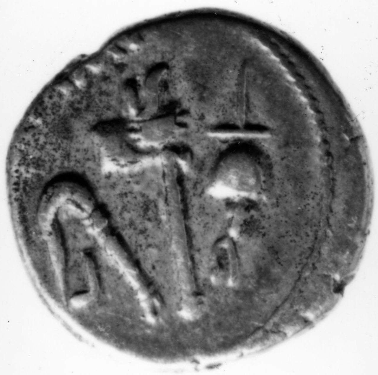 Dritto: Brocca con manico e corvo, tracce di legenda. contorno perlinato. Rovescio: Strumenti sacrificali, tracce di legenda. Contorno perlinato