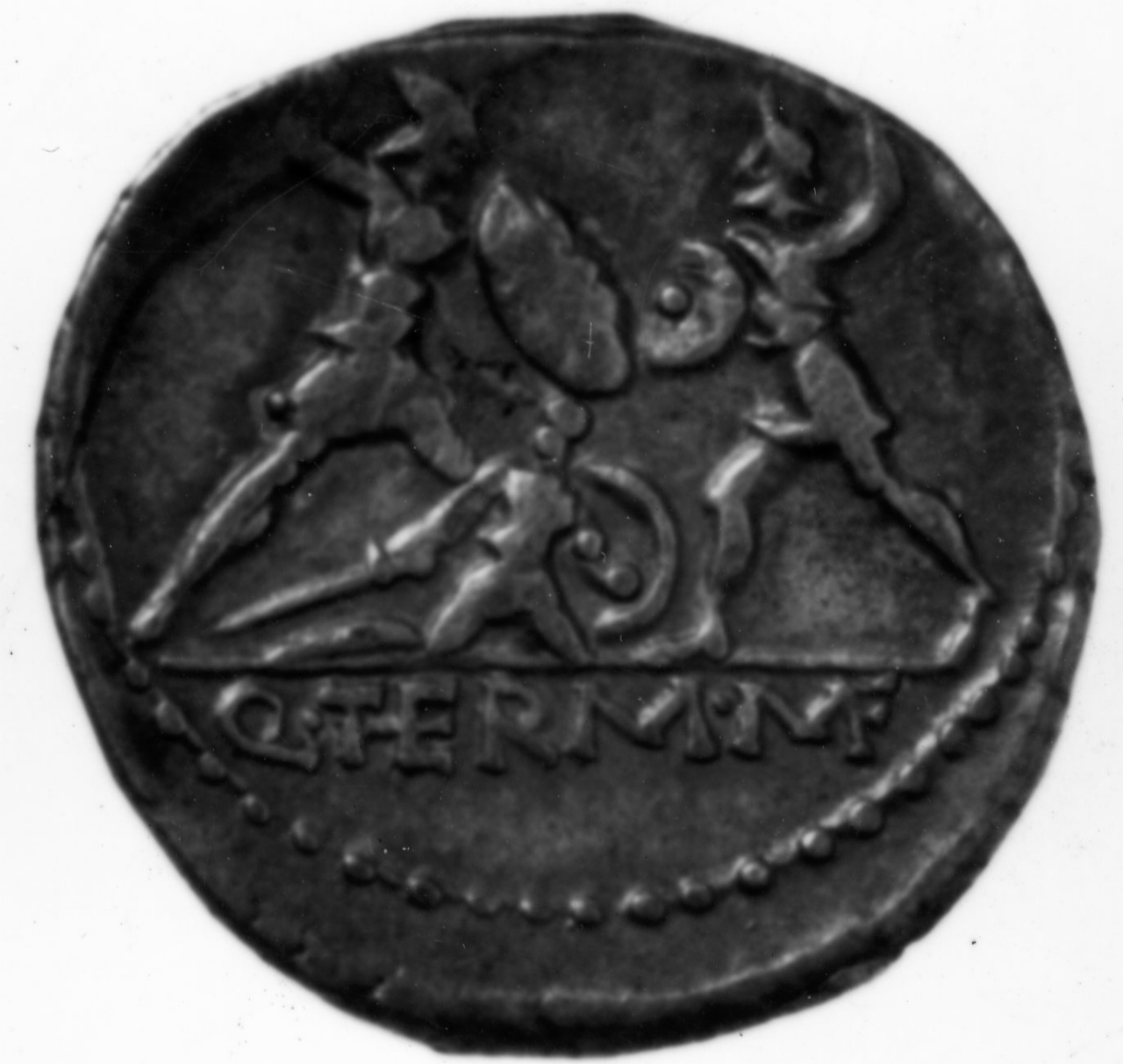 Dritto: Testa elmata di Marte volta a s. Contorno perlinato. Rovescio: Un guerriero barbaro a d. ed un soldato romano a s. che combattono, fra i due un altro soldato romano caduto a terra. Contorno perlinato. iscrizione all'esergo