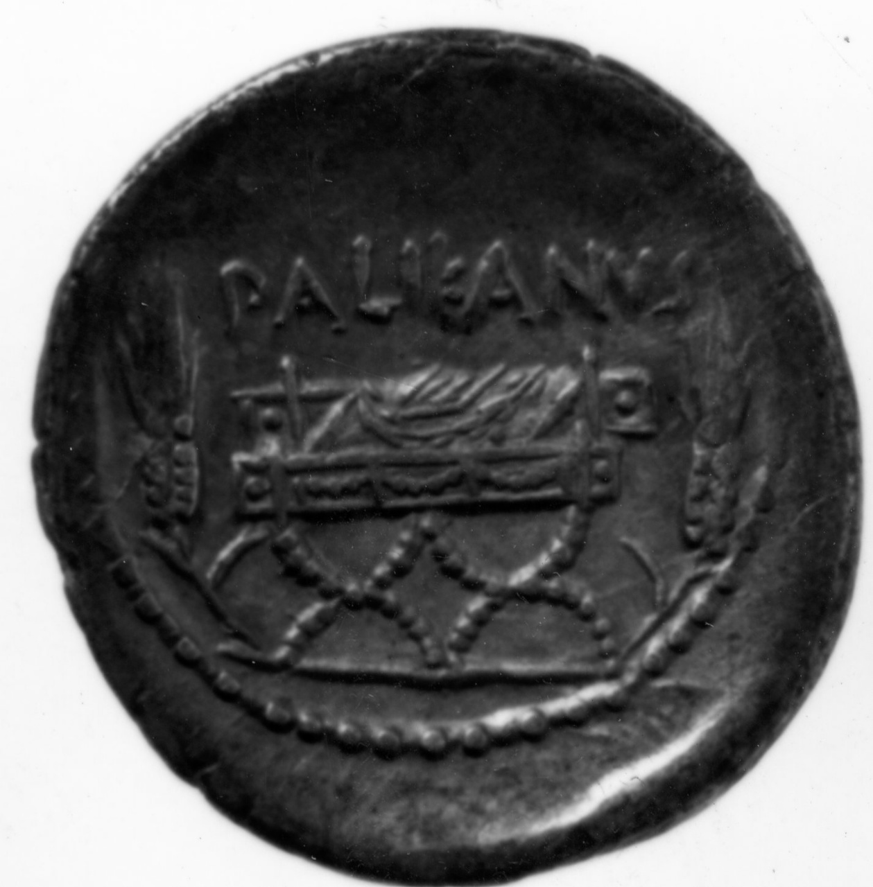 Dritto: Testa laureata dell'Onore volta a d. Contorno perlinato. iscrizione dietroi lcollo. Rovescio: Sedia curule fra due spighe di grano, iscrizione sopra. Contorno perlinato