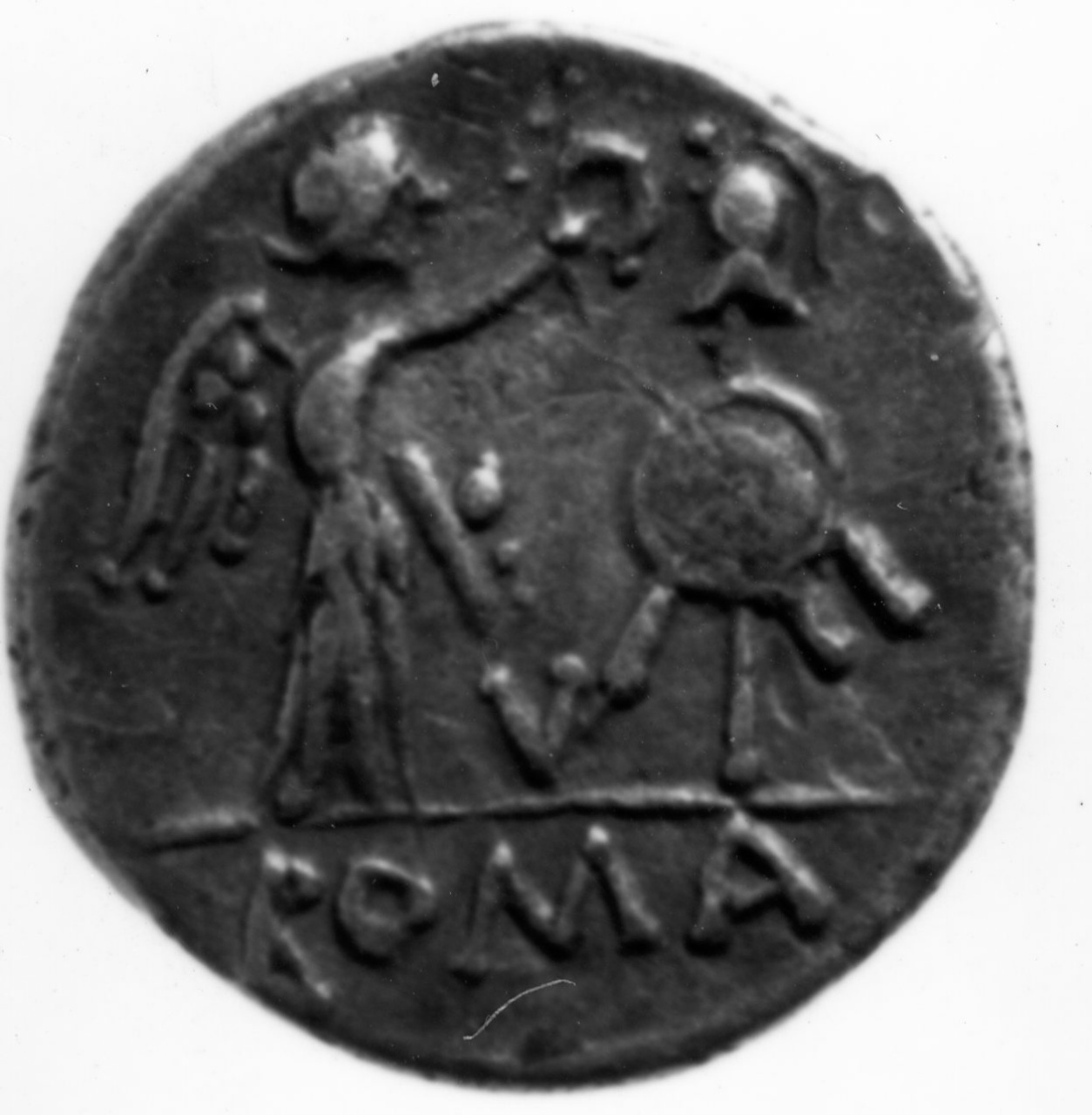 Dritto: Testa laureata di Apollo volta a d. Contorno lineare. Rovescio: La vittoria alata volta a d. in atto di incoronare un trofeo di guerra, fra loro segno di valore (V). iscrizione all'esergo