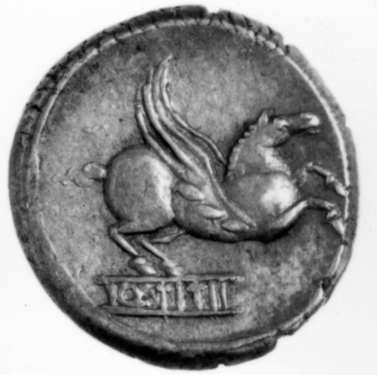 Dritto: Testa di Mutino titino con diadema alato volta a d. Contorno perlinato. Rovescio: Pegaso su tavoletta con iscrizione da cui sta spiccando il volo verso d
