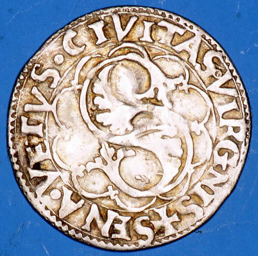 Dritto: lettera S fogliata; cornice ad archetti pensili; cerchio lineare. Iscrizione. Rovescio: Al centro croce fogliata e stemma del Comune di Siena, stemma zecchiere, iscrizione al bordo, doppio cerchio lineare, bordo perlato