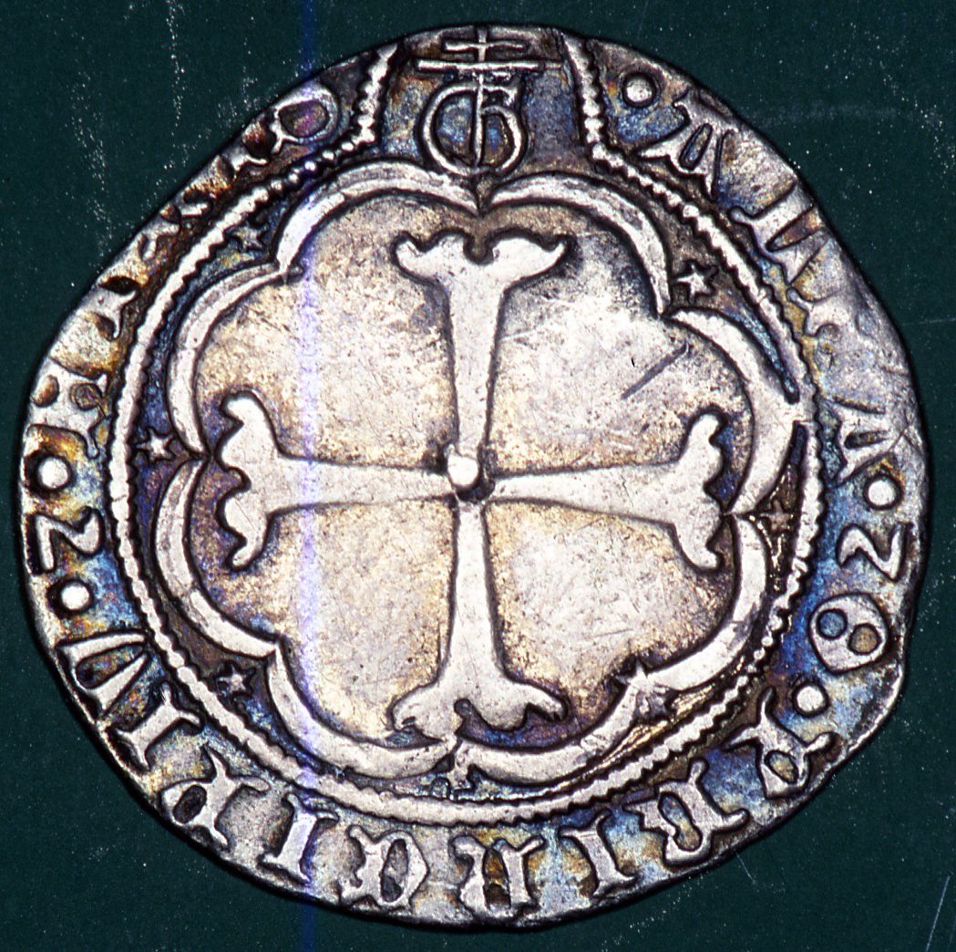 Dritto: lettera S fogliata; cornice a doppi archetti pensili; cerchio perlato, stellette; crocetta. Iscrizione. Rovescio: Al centro croce fogliata cornice a doppi archetti pensili; cerchio perlinato; stellette e stemma zecchiere, iscrizione al bordo
