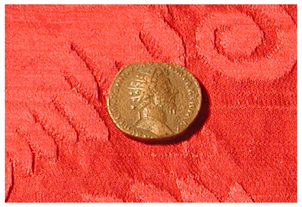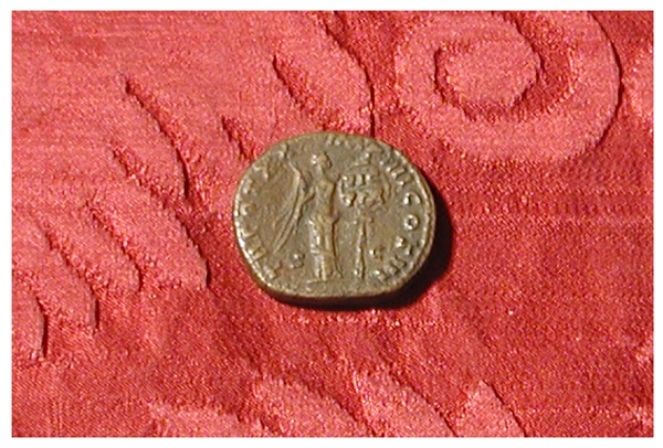 Dritto: Testa radiata di Marco Aurelio a d. Contorno non visibile. Rovescio: La Vittoria, stante di prospetto con la testa rivolta a d, tiene un ramo di palma e pone su di un albero di palma uno scudo con l'iscrizione: VIC / PAR; ai lati, nel campo: S - C. Contorno di perline. Marchio del senato romano, ai lati del tipo principale (Senatus Consulto)