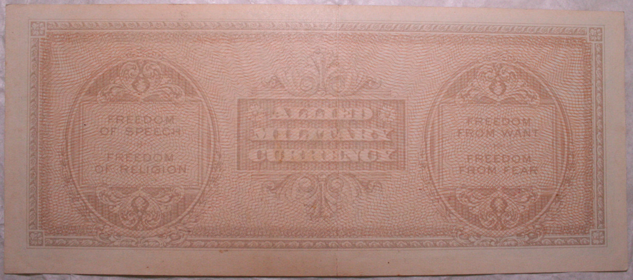 Dritto: Cornici con arabeschi di colore azzurro. Filigrana: Allied Military Authority. Rovescio: Cornici con arabeschi di colore marrone