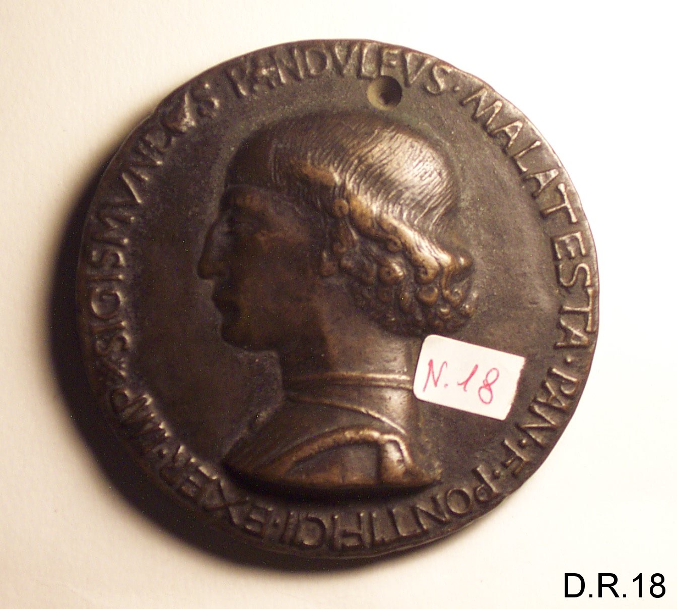 Dritto: busto di Sigismondo Pandolfo Malatesta volto a s. con corazza. capo nudo. Rovescio: donna con testa coronata, seduta sopra seggio formato da dueelefanti,tiene nelle mani una colonna spezzata