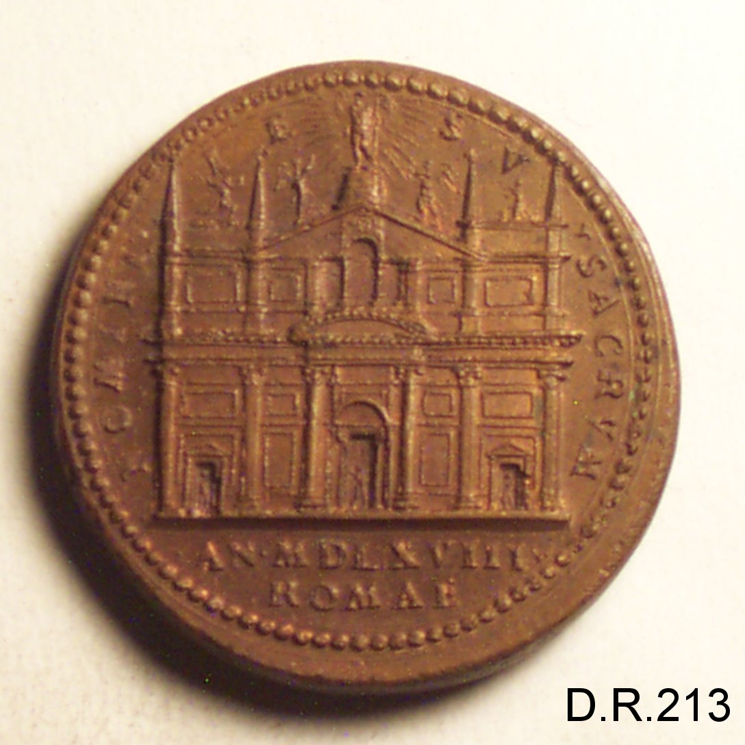 Dritto: busto del cardinale Alessandro Farnese volto a s. con mozzetta; caponudo,barba. Rovescio: la facciata della chiesa del Gesù, a Roma