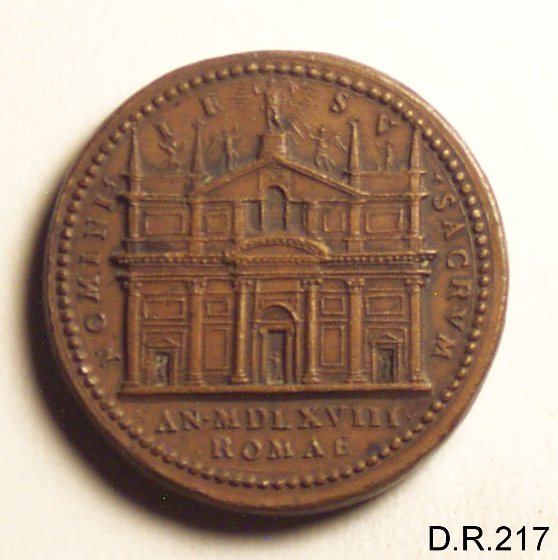 Dritto: busto del cardinale Alessandro Farnese volto a s. con mozzetta; caponudo,barba. Rovescio: la facciata della chiesa del Gesù, a Roma