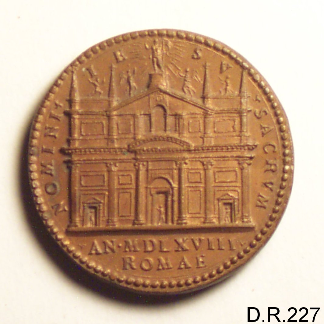 Dritto: busto del cardinale Alessandro Farnese volto a s. con mozzetta; caponudo,barba. Rovescio: la facciata della chiesa del Gesù, a Roma