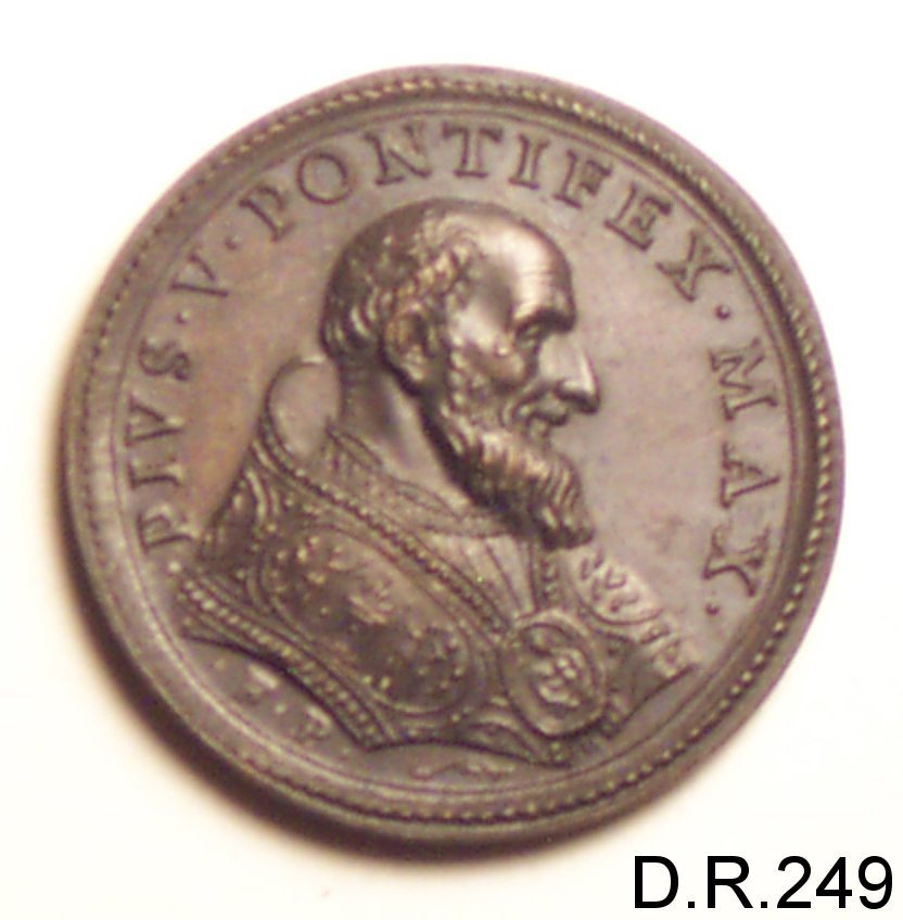 Dritto: busto di papa Pio V volto a d. con piviale; capo nudo, barba. Rovescio: 1566. pivs. v. / ghislerivs./ boschen. pont./ max. ecclesiam./ s. +ordini.pre/ dic. alvno. svo. ac./ patriae. eri./ gendam. cv./ ravit. do./ tavit.q