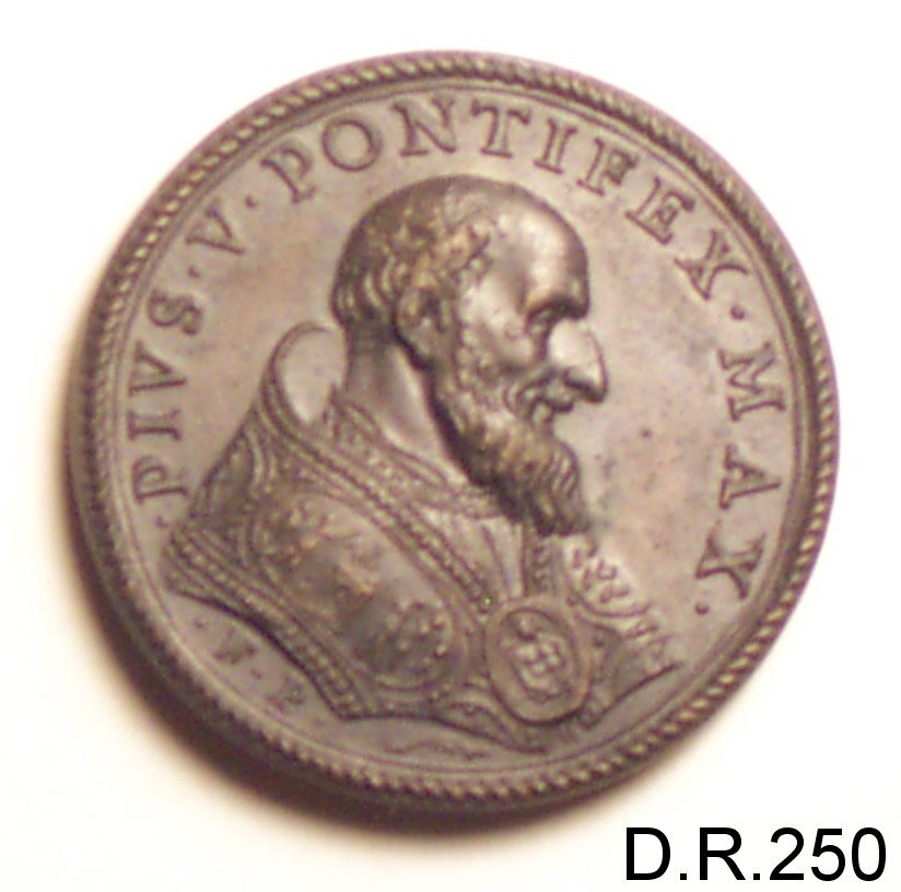 Dritto: busto di papa pio v volto d . con piviale; capo nudo, barba. Rovescio: la pace, in figura di donna, con cornucopia nella sinistra, da' fuoco aunfascio d'armi