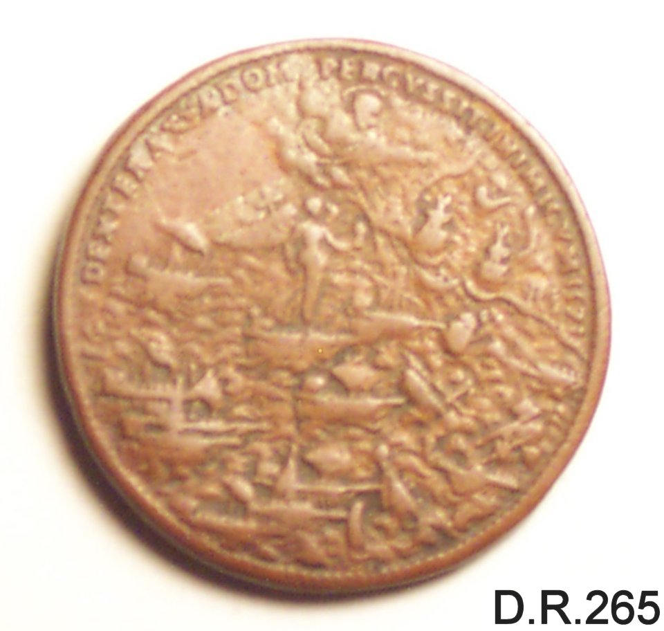 Dritto: busto di papa Pio V volto a s. con mozzetta e camauro; barbato. Rovescio: la battaglia di Lepanto; un angelo, con la croce e il caice, aleggiasullenavi cristiane; su quelle turche cadono i fulmini lanciatidall'Eterno,che appare tra le nuvole