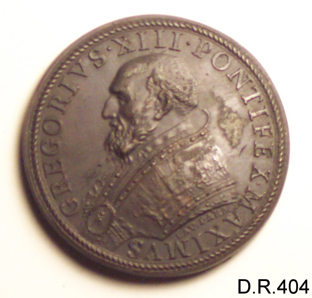 Dritto: busto di papa gregorio xiii volto a s. con piviale; capo nudo, barba.sulpiviale e' raffigurata la scena della crocifissione di san pietro. Rovescio: la facciata della basilicadi san pietro a roma, sec.ndo il progettodigiacomo della porta