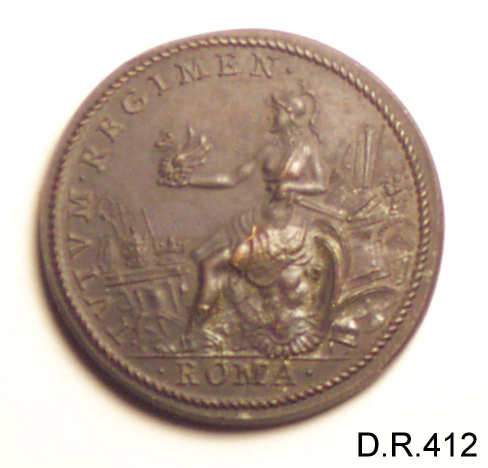 Dritto: busto di papa sisto V volto a d. con mozzetta e camauro; barba. Rovescio: donna con elmo, seduta sopra un fascio di armi, con un drago nelladestraprotesa