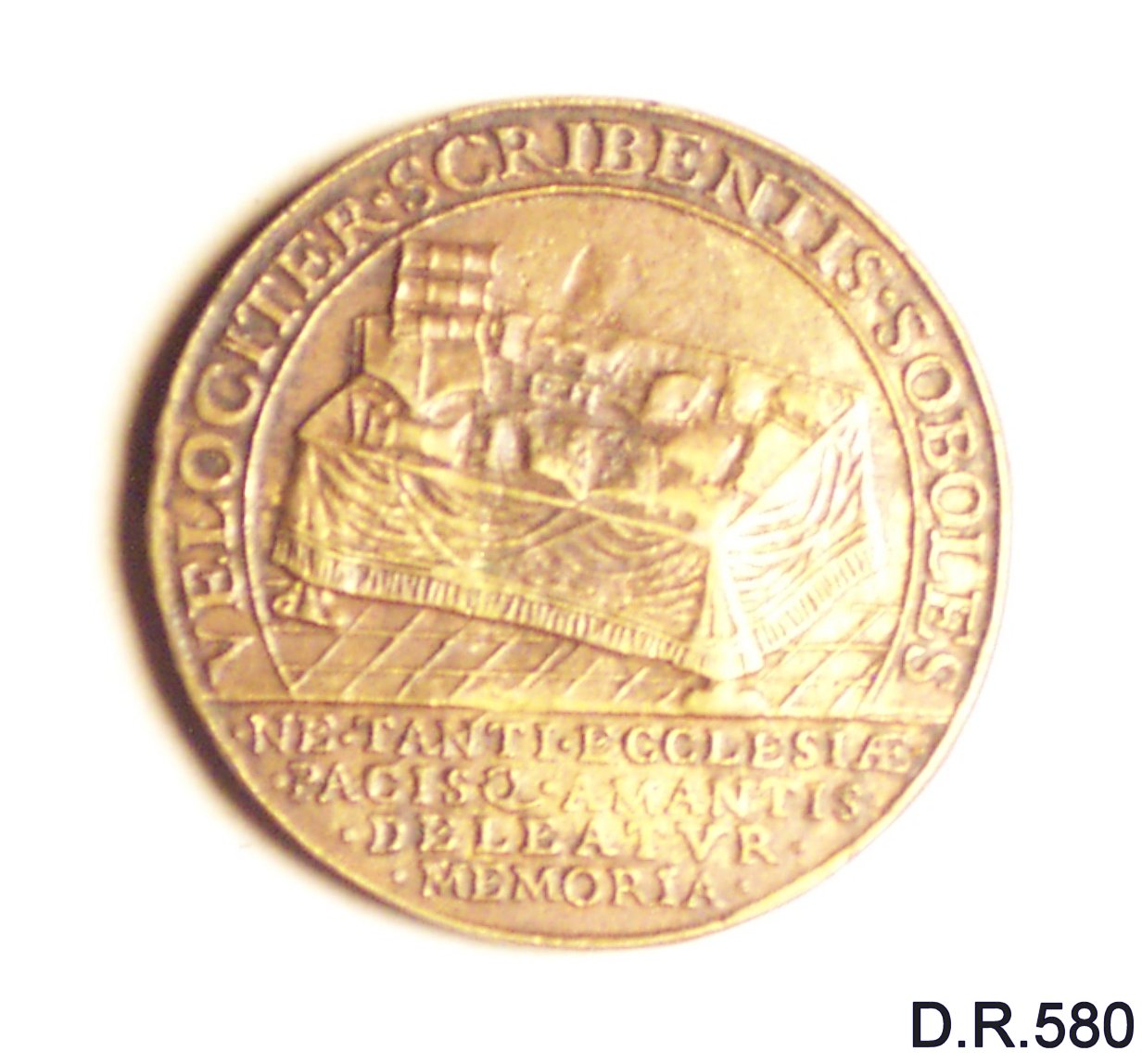 Dritto: busto di Pio II volto a sinistra con mozzetta e camauro. Rovescio: tavola con sopra alcuni libri, su uno dei quali silegge:imposita.tvrcarvm.lex