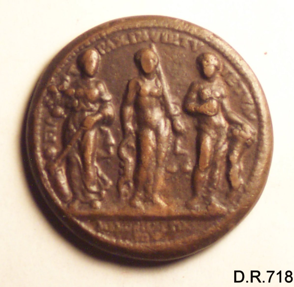 Dritto: busto di Marcello II volto a sinistra con piviale, capo nudo e barba. Rovescio: tre figure muliebri in piedi, con gli attributi della pace, dellagiustiziae dell'abbondanza