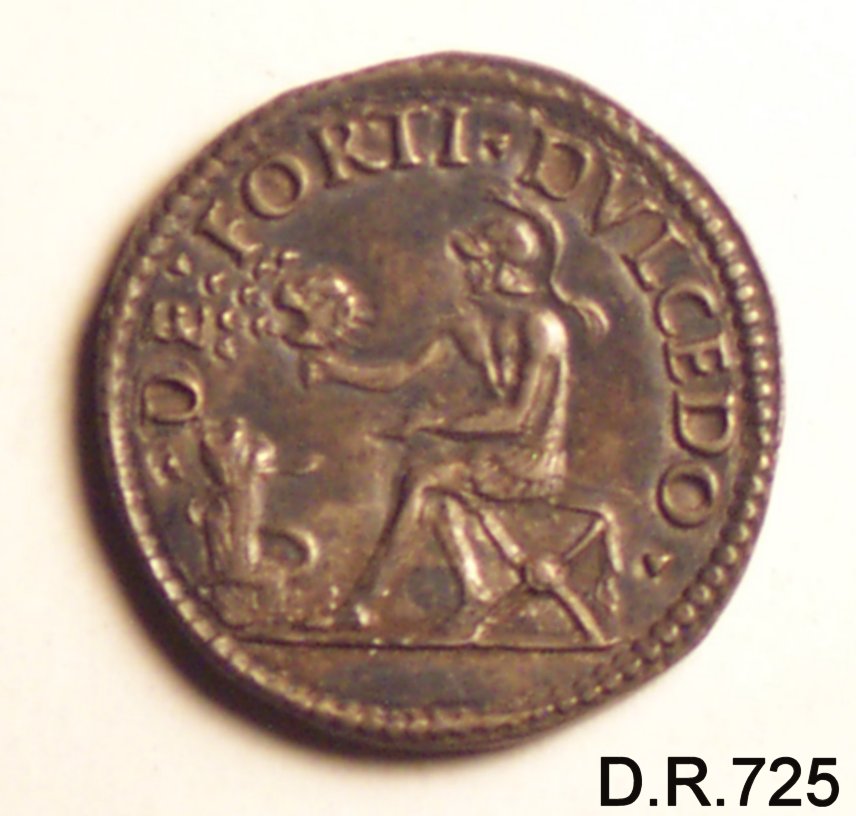 Dritto: busto di Alfonso I D'Este volto a destra, con capelli lunghi e berretto. Rovescio: Sansone seduto, con nella destra protesa il capo del leone di timna,dallacui bocca viene fuori uno sciame d'api