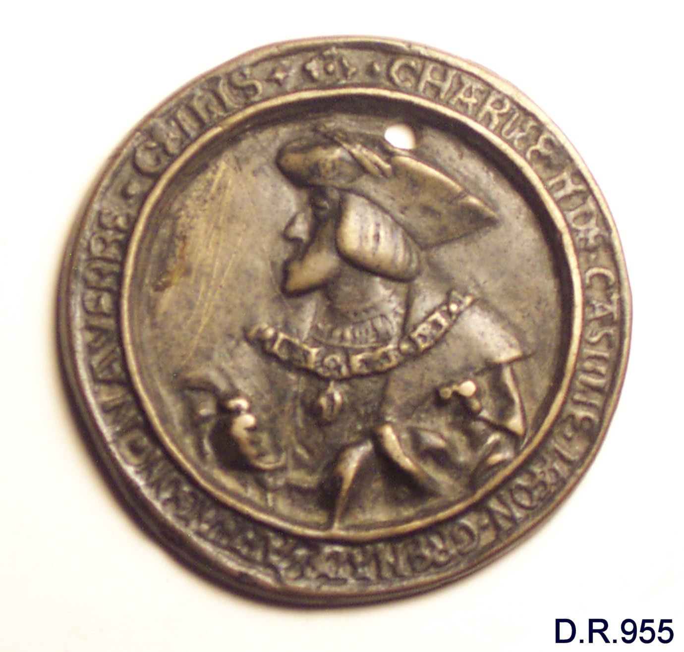 Dritto: Busto di Carlo V volto a sinistra, con berretto, capelli lunghi etosond'oro; nella mano destra stringe il manico del pugnale. Rovescio: