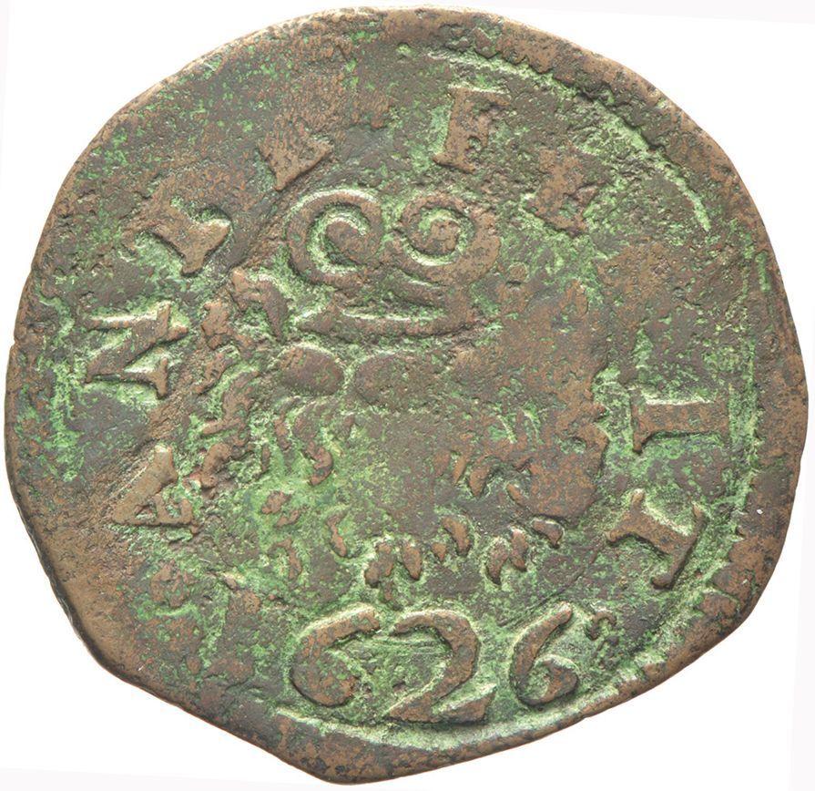 Dritto: Busto del re volto a d., con corona radiata e corazza; nel campo a s., M | C. Campo monetale delimitato da filetto perlinato. Rovescio: Acciarino su pietre focaie in fiamme; sotto, 1626 •. Campo monetale delimitato da filetto perlinato