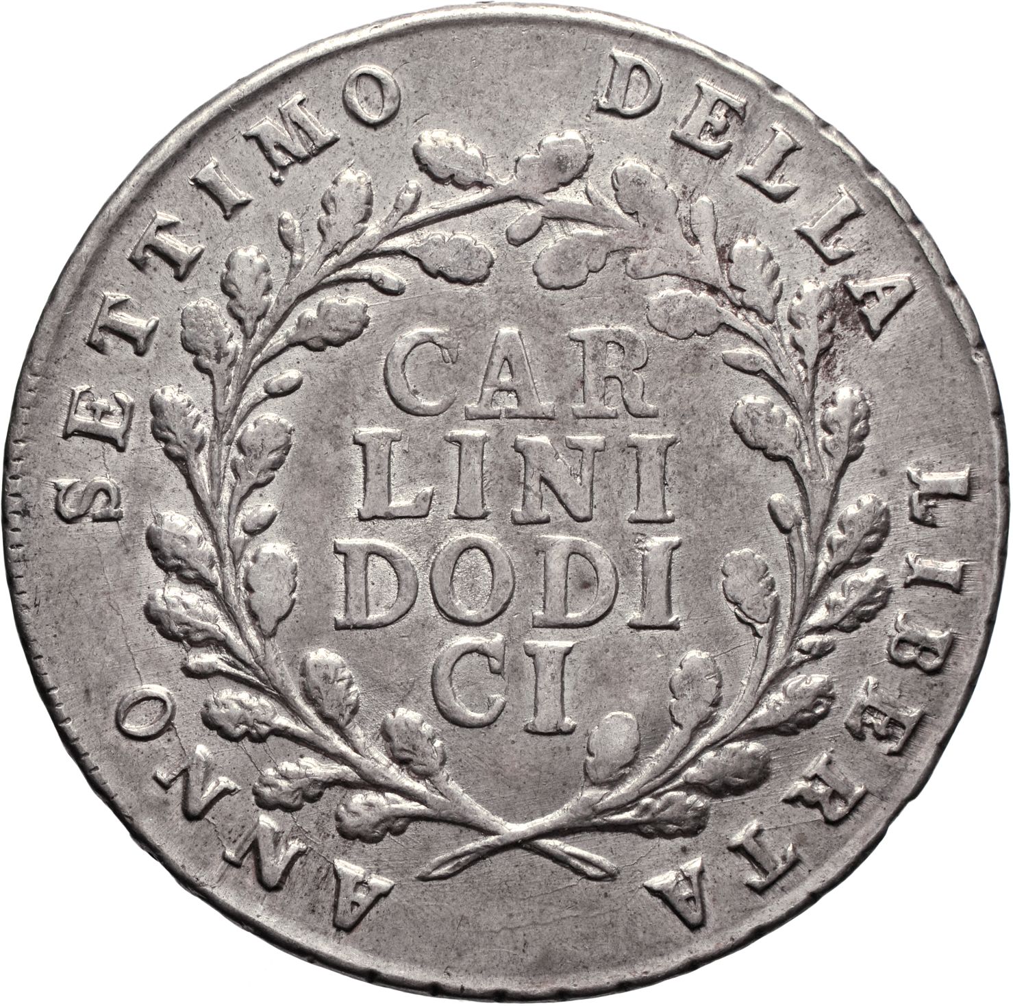 Dritto: Personificazione della Libertas (o della Repubblica) in piedi, volta a d., sostiene con la s. un fascio littorio e con la d. un’asta sormontata da pileo, mentre con un piede calpesta una corona reale rovesciata; dinanzi a lei, un arco con corda spezzata. Campo monetale delimitato da filetto lineare. Rovescio: Nel campo, tra due rami di quercia, CAR|LINI | DODI|CI. Campo monetale delimitato da filetto lineare