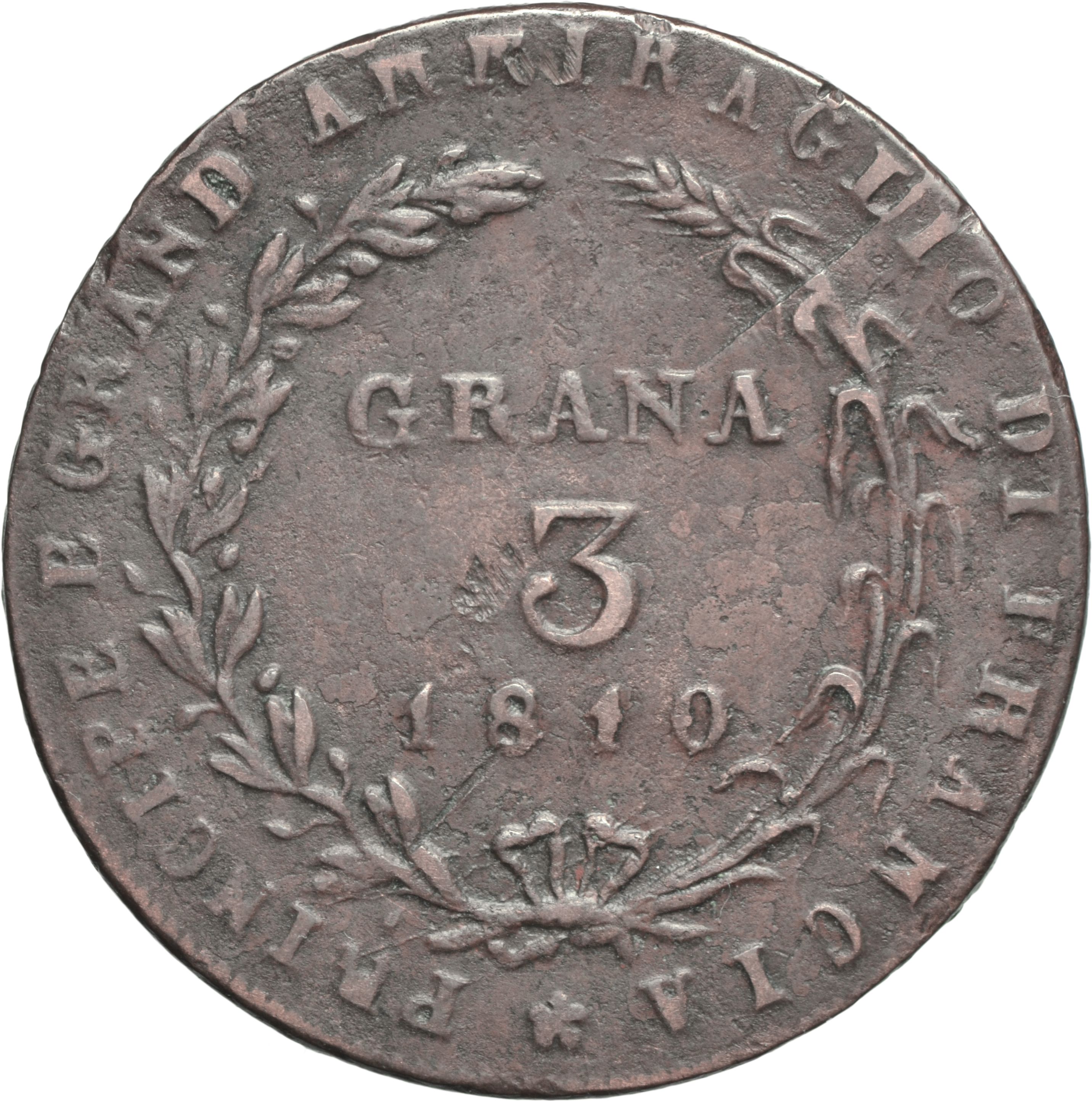 Dritto: Testa nuda del re volta a s. Campo monetale delimitato da filetto dentellato. Rovescio: In corona composta da un ramo di olivo e due spighe di grano, GRANA | 3 | 1810. Campo monetale delimitato da filetto dentellato