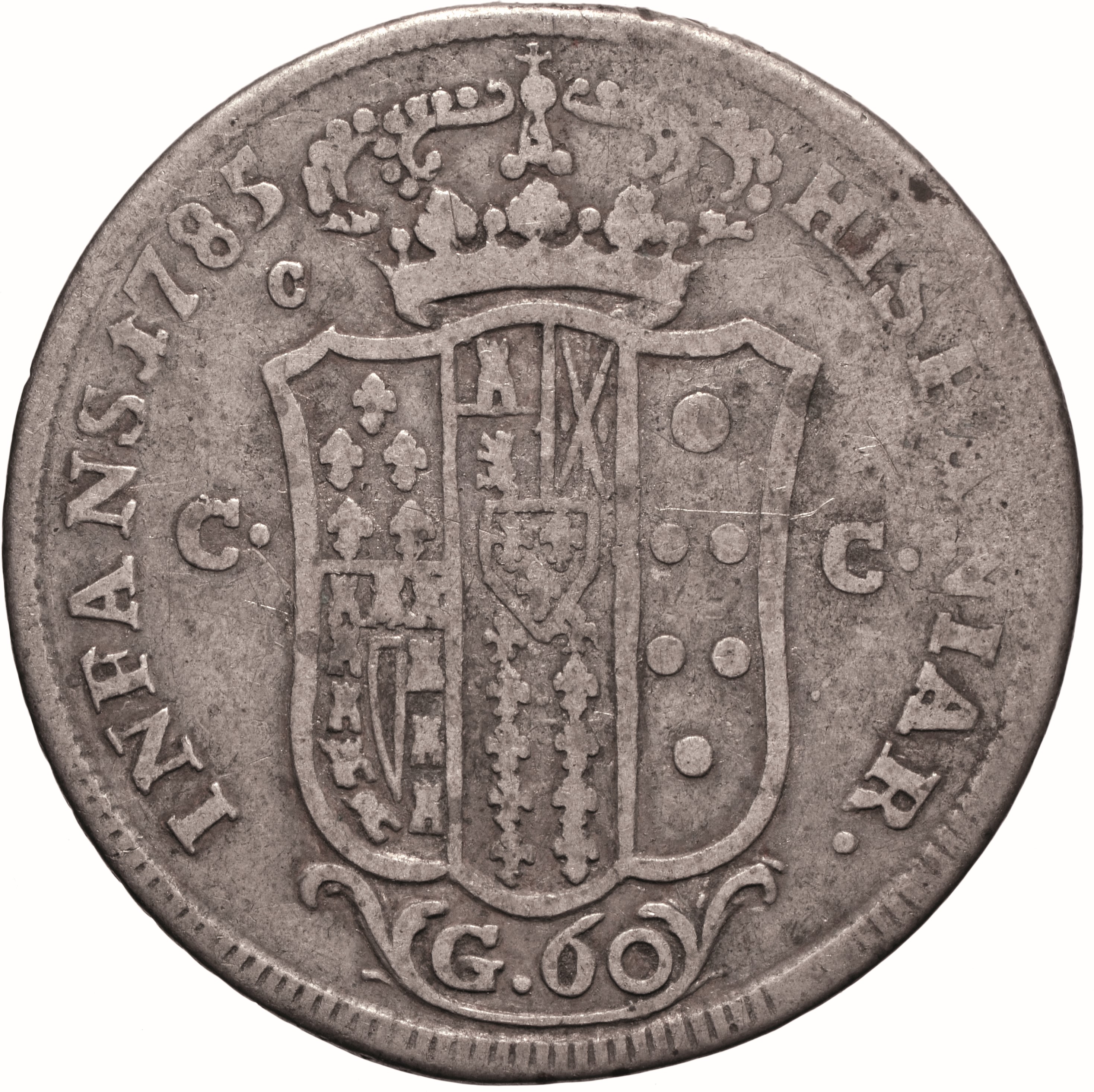 Dritto: Busto adulto del re volto a d., corazzato e a testa nuda con lunghi capelli sciolti; sotto, B. P. . Campo monetale delimitato da filetto dentellato. Rovescio: Scudo sagomato coronato, in cartella semplice, interzato in palo: nel 1°, troncato di Farnese e di Portogallo; nel 2°, troncato: in a), partito, in 1, di Castiglia e León, in 2, di Sicilia, in b), di Angiò; nel 3°, di Medici; nel centro, scudetto di Borbone. Nel campo, in alto a s., C; al centro, C∙ / C∙; in basso, tra motivi vegetali, G. 60. Campo monetale delimitato da filetto dentellato. T/ cordone