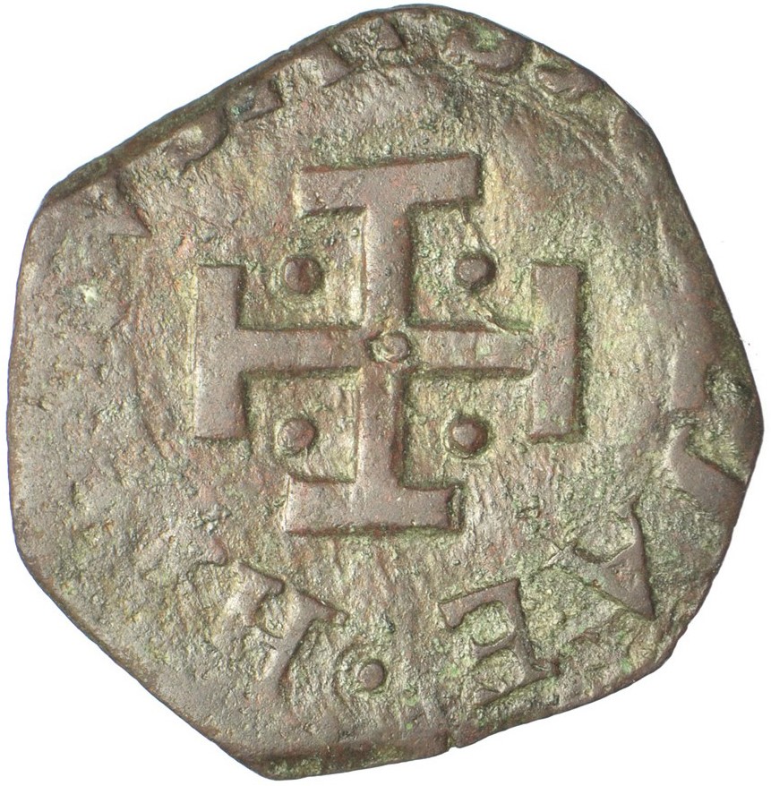 Dritto: Testa radiata del re, volta a d., con drappeggio sulla spalla sinistra; sotto la testa, ∙:∙ Campo monetale delimitato da filetto perlinato. Rovescio: Croce di Gerusalemme cantonata da globetti. Campo monetale delimitato da filetto perlinato