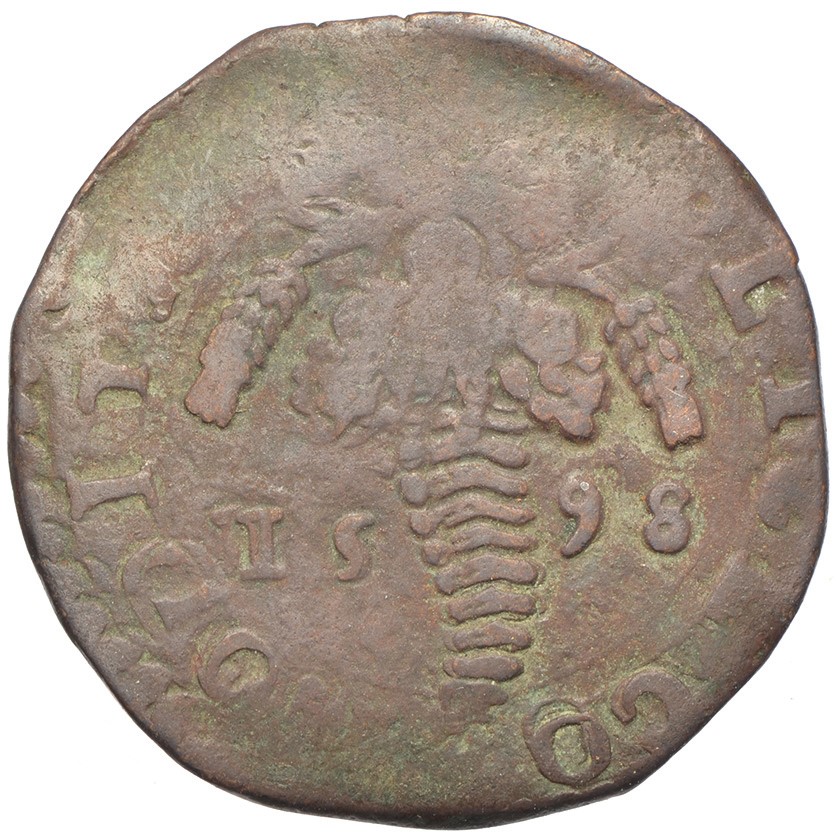 Dritto: Testa radiata del re volta a d., con drappeggio sulla spalla sinistra; sotto, •. Campo monetale delimitato da filetto perlinato (scarsamente visibile). Rovescio: Cornucopia con frutta e spighe; ai lati 15/98. Campo monetale delimitato da filetto perlinato