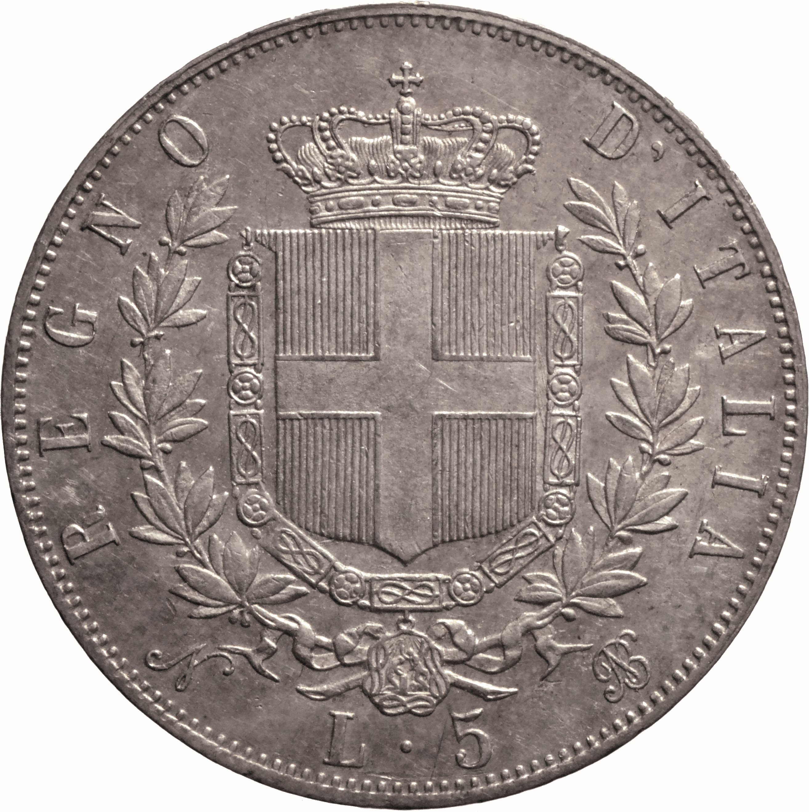 Dritto: Testa nuda del re volta a d.; sotto il taglio del collo, FERRARIS; sotto, nel giro della legenda, 1865. Campo monetale delimitato da cornice dentellata. Rovescio: Tra due rami di alloro legati in basso, scudo di Savoia coronato, cinto dal collare dell’Ordine della Santissima Annunziata; sotto, nel giro della legenda, N L · 5 BN (in legatura). Campo monetale delimitato da cornice dentellata