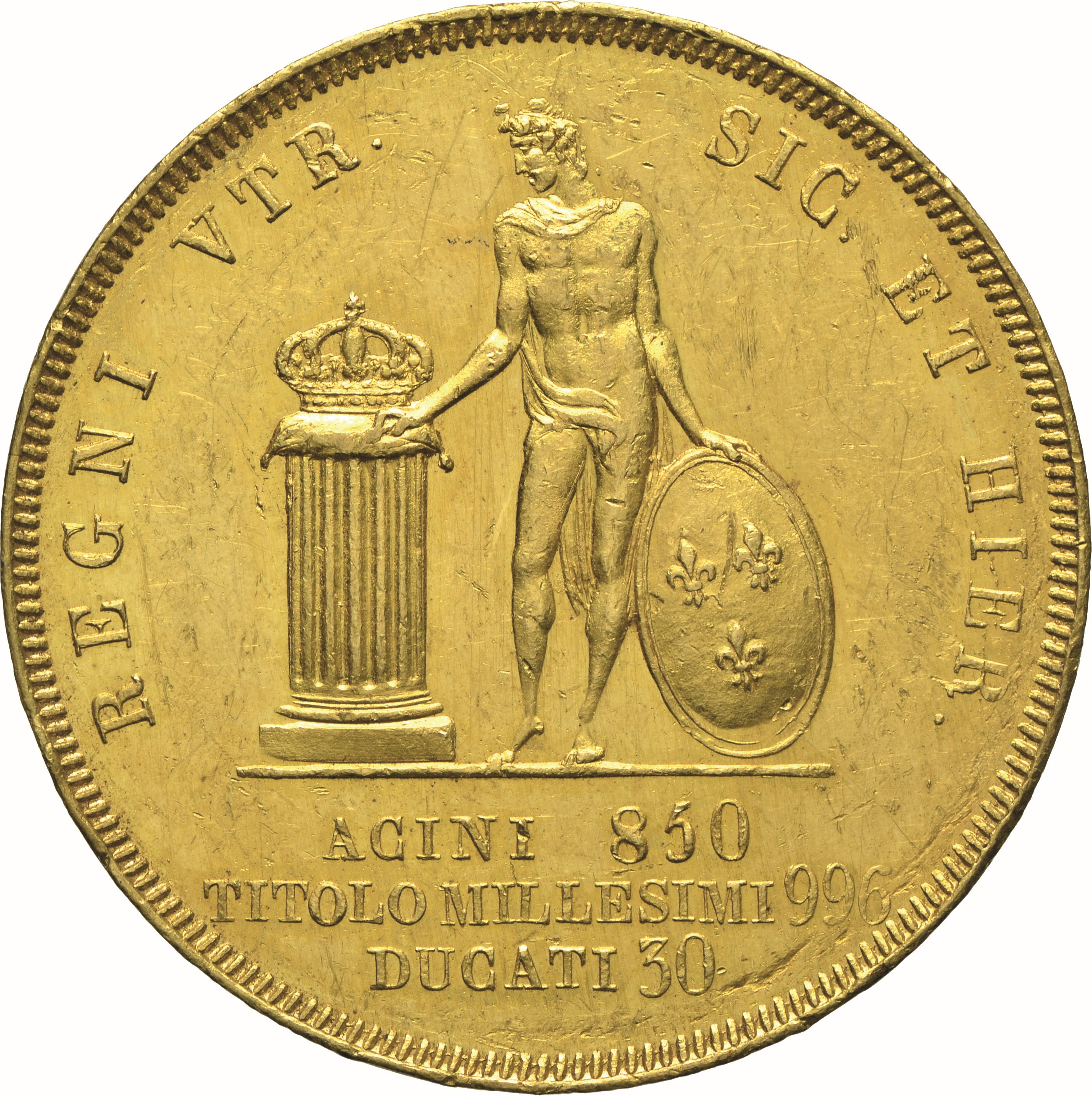 Dritto: Testa nuda adulta del re volta a d.; sotto, 1840. Campo monetale delimitato da cornice liscia e filetto dentellato. Rovescio: Genio borbonico alato volto a s., in piedi, con la mano d. poggiata su colonna, sulla quale è adagiato un cuscino con corona reale, e con la s. sostiene uno scudo con l’arme di Borbone. In esergo, ACINI 850 | TITOLO MILLESIMI 996 | DUCATI 30. Campo monetale delimitato da cornice liscia e filetto dentellato