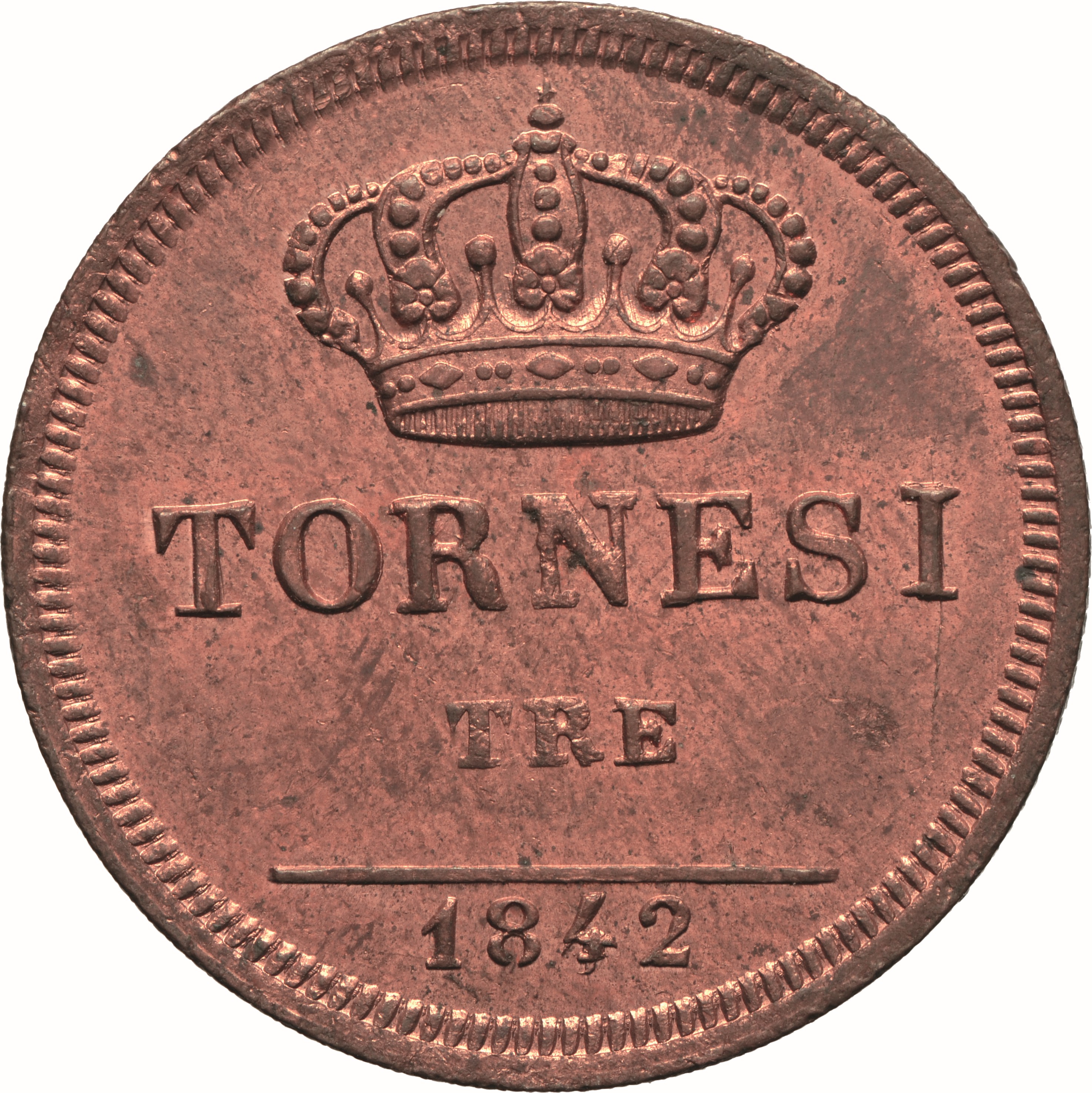 Dritto: Testa nuda adulta del re volta a d.; sotto, (stella). Campo monetale delimitato da cornice liscia e filetto dentellato. Rovescio: Nel campo: corona reale | TORNESI | TRE; in esergo, 1842. Campo monetale delimitato da cornice liscia e filetto dentellato