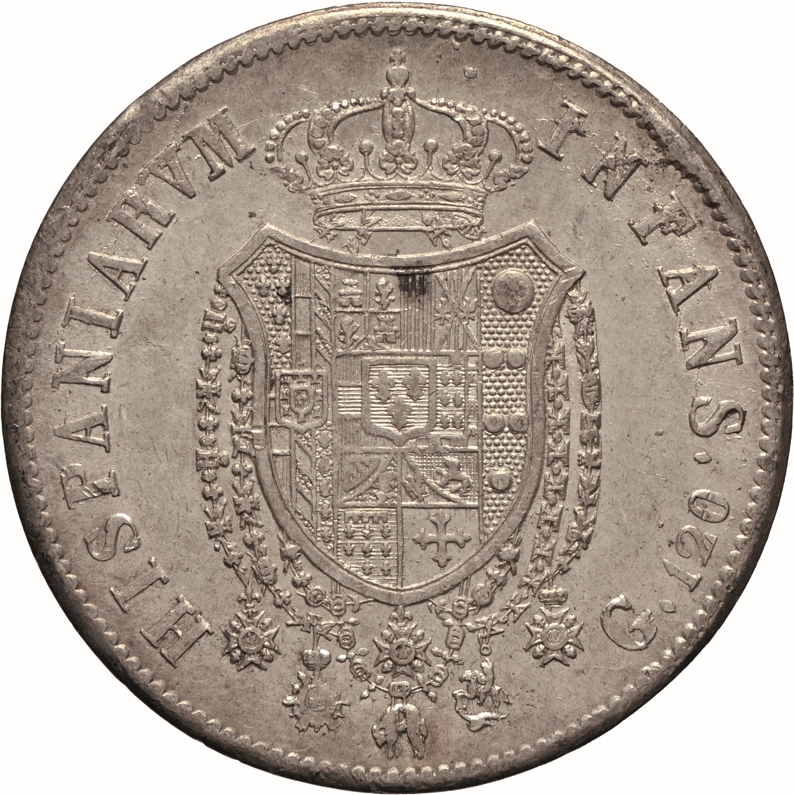 Dritto: Testa coronata del re volta a d., con lunghi capelli ricci; sotto, 1818♦. Campo monetale delimitato da cornice con filetto perlinato. Rovescio: Scudo sagomato in cartella semplice, coronato e cinto dai collari degli Ordini di 1) Spirito Santo, 2) san Gennaro, 3) Carlo III, 4) san Ferdinando e del merito, 5) Costantiniano di san Giorgio, 6) Toson d’oro, interzato in palo: nel 1°, troncato, in a) interzato in palo, di 1, Farnese, 2, Austria, 3, Borgogna Antica; in b), interzato in palo, di 1, Austria, 2, Borgogna Antica, 3, Farnese; sul tutto, scudetto di Portogallo. Nel 2°, interzato in fascia, in a), partito, 1), inquartato di Castiglia e León con sulla base l’arme di Granada, 2), contropartito di Aragona e di Sicilia; in b), partito di Austria e Borgogna Moderna; in c), inquartato, 1) tagliato di Borgogna Antica e Fiandre, 2) trinciato di Tirolo e Brabante, 3) di Angiò, 4) di Gerusalemme; nel 3°, di Medici; nel centro, scudetto di Borbone. Nel campo, a destra, contro l’orlo, G♦ 120. Campo monetale delimitato da cornice con filetto perlinato