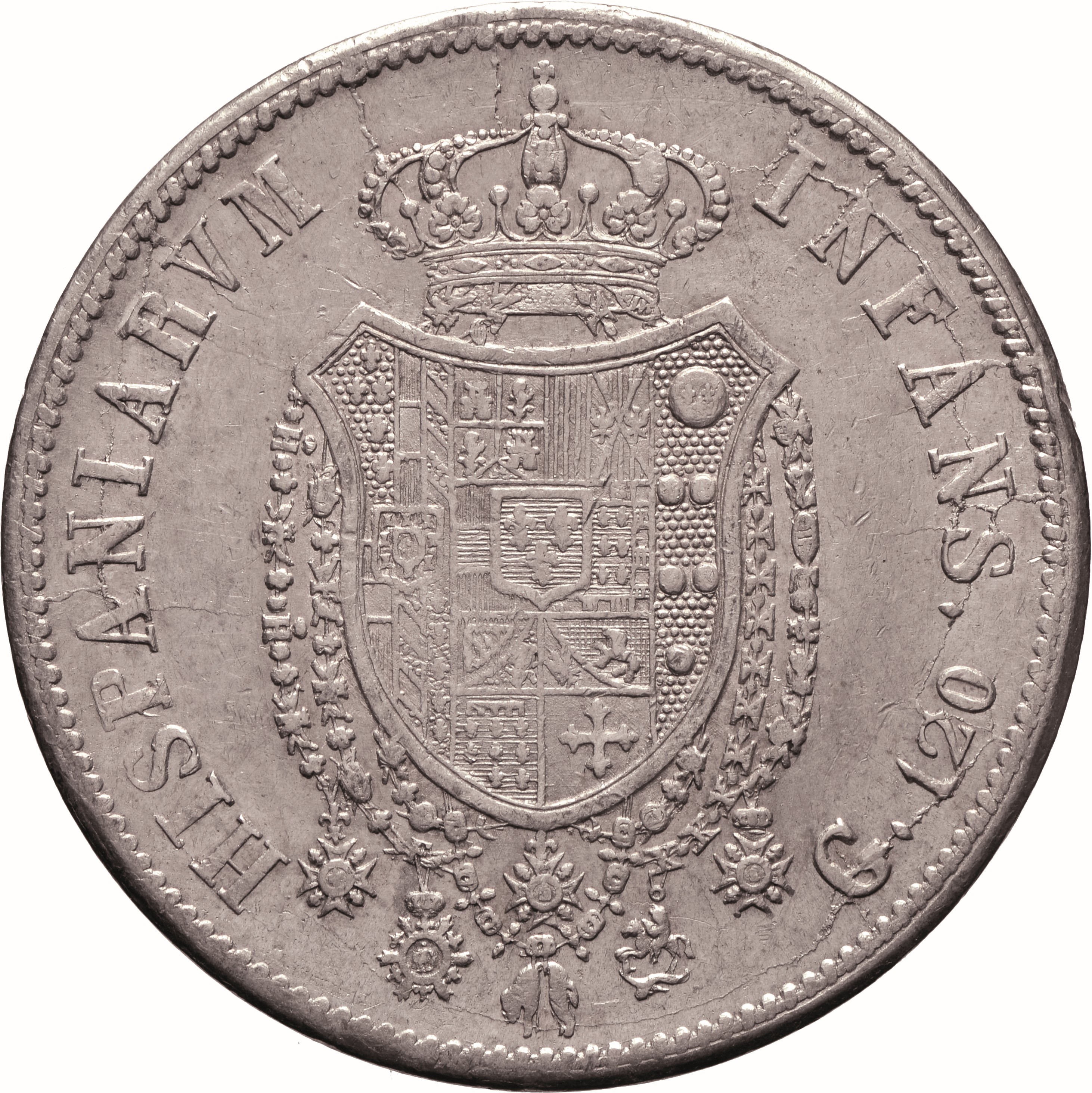 Dritto: Testa coronata del re volta a d., con lunghi capelli ricci; sotto, 1818♦. Campo monetale delimitato da cornice con filetto perlinato. Rovescio: Scudo sagomato in cartella semplice, coronato e cinto dai collari degli Ordini di 1) Spirito Santo, 2) san Gennaro, 3) Carlo III, 4) san Ferdinando e del merito, 5) Costantiniano di san Giorgio, 6) Toson d’oro, interzato in palo: nel 1°, troncato, in a) interzato in palo, di 1, Farnese, 2, Austria, 3, Borgogna Antica; in b), interzato in palo, di 1, Austria, 2, Borgogna Antica, 3, Farnese; sul tutto, scudetto di Portogallo. Nel 2°, interzato in fascia, in a), partito, 1), inquartato di Castiglia e León con sulla base l’arme di Granada, 2), contropartito di Aragona e di Sicilia; in b), partito di Austria e Borgogna Moderna; in c), inquartato, 1) tagliato di Borgogna Antica e Fiandre, 2) trinciato di Tirolo e Brabante, 3) di Angiò, 4) di Gerusalemme; nel 3°, di Medici; nel centro, scudetto di Borbone. Nel campo, a destra, contro l’orlo, G♦ 120. Campo monetale delimitato da cornice con filetto perlinato