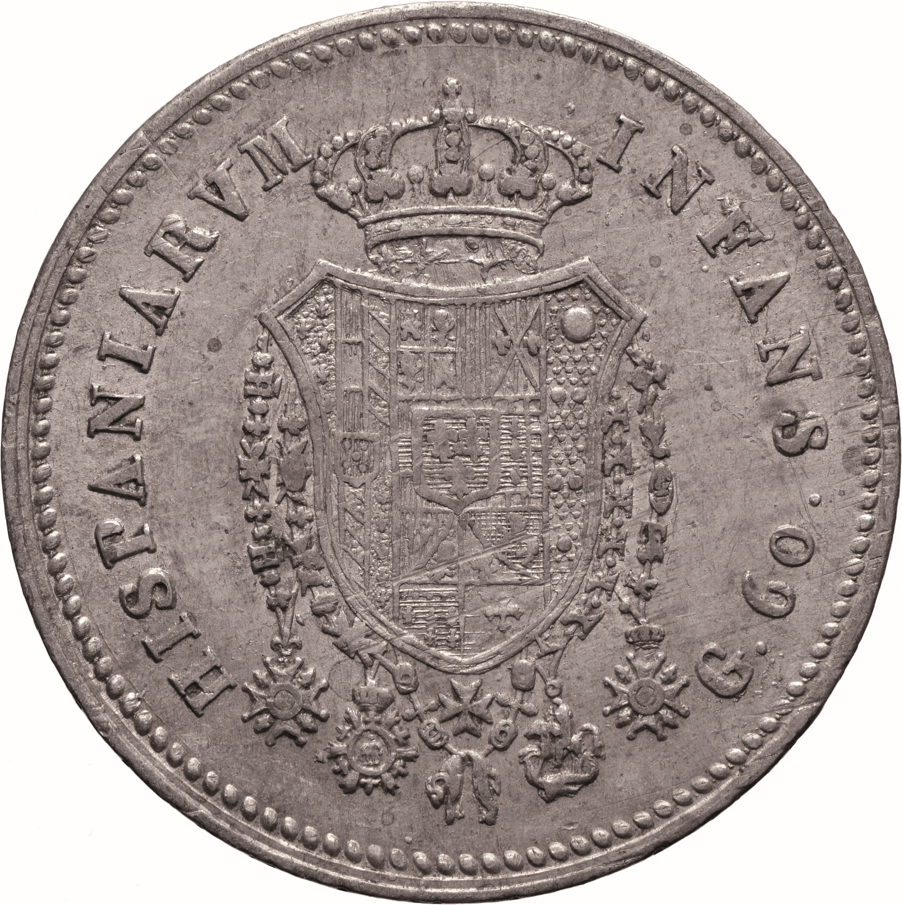Dritto: Testa coronata del re volta a d., con lunghi capelli ricci; sotto, 1818. Campo monetale delimitato da cornice con filetto dentellato. Rovescio: Scudo sagomato in cartella semplice, coronato e cinto dai collari degli Ordini di 1) Spirito Santo, 2) san Gennaro, 3) Carlo III, 4) san Ferdinando e del merito, 5) Costantiniano di san Giorgio, 6) Toson d’oro, interzato in palo: nel 1°, troncato, in a) interzato in palo, di 1, Farnese, 2, Austria, 3, Borgogna Antica; in b), interzato in palo, di 1, vuoto, 2, Borgogna Antica, 3, Farnese; sul tutto, scudetto di Portogallo. Nel 2°, interzato in fascia, in a), partito, 1), inquartato di Castiglia e León, 2), contropartito di Aragona e di Sicilia; in b), partito di Austria e Borgogna Moderna; in c), inquartato, 1) tagliato di Borgogna Antica e Fiandre, 2) trinciato di Tirolo e Brabante, 3) di Angiò, 4) di Gerusalemme; nel 3°, di Medici; nel centro, scudetto di Borbone. Nel campo, a destra, contro l’orlo, G♦ 60♦. Campo monetale delimitato da cornice con filetto dentellato