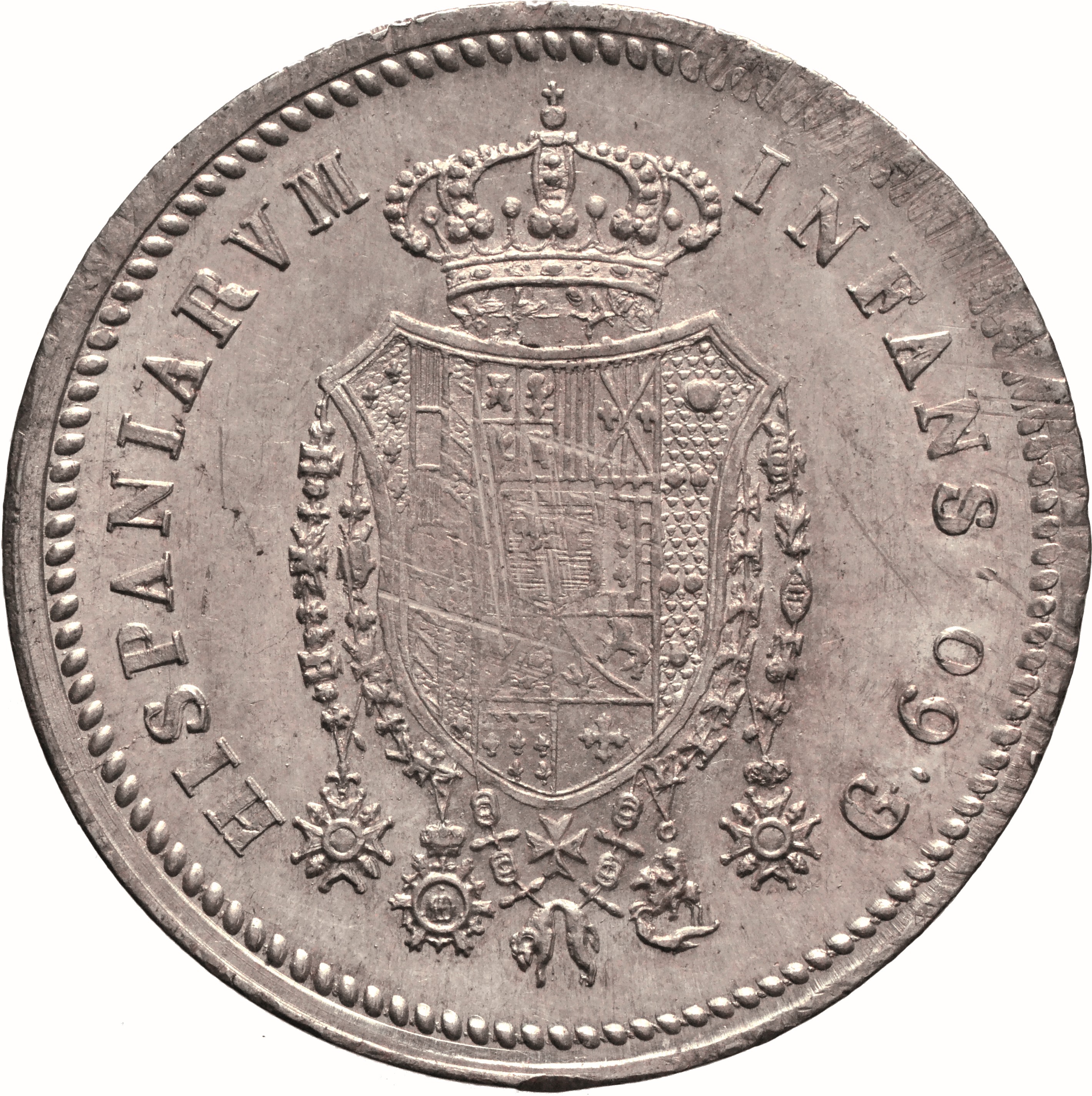 Dritto: Testa coronata del re volta a d., con lunghi capelli ricci; sotto, 1818. Campo monetale delimitato da cornice con filetto dentellato. Rovescio: Scudo sagomato in cartella semplice, coronato e cinto dai collari degli Ordini di 1) Spirito Santo, 2) san Gennaro, 3) Carlo III, 4) san Ferdinando e del merito, 5) Costantiniano di san Giorgio, 6) Toson d’oro, interzato in palo: nel 1°, troncato, in a) interzato in palo, di 1, Farnese, 2, Austria, 3, Borgogna Antica; in b), interzato in palo, di 1, vuoto, 2, Borgogna Antica, 3, Farnese; sul tutto, scudetto di Portogallo. Nel 2°, interzato in fascia, in a), partito, 1), inquartato di Castiglia e León, 2), contropartito di Aragona e di Sicilia; in b), partito di Austria e Borgogna Moderna; in c), inquartato, 1) tagliato di Borgogna Antica e Fiandre, 2) trinciato di Tirolo e Brabante, 3) di Angiò, 4) di Gerusalemme; nel 3°, di Medici; nel centro, scudetto di Borbone. Nel campo, a destra, contro l’orlo, G♦ 60♦. Campo monetale delimitato da cornice con filetto dentellato