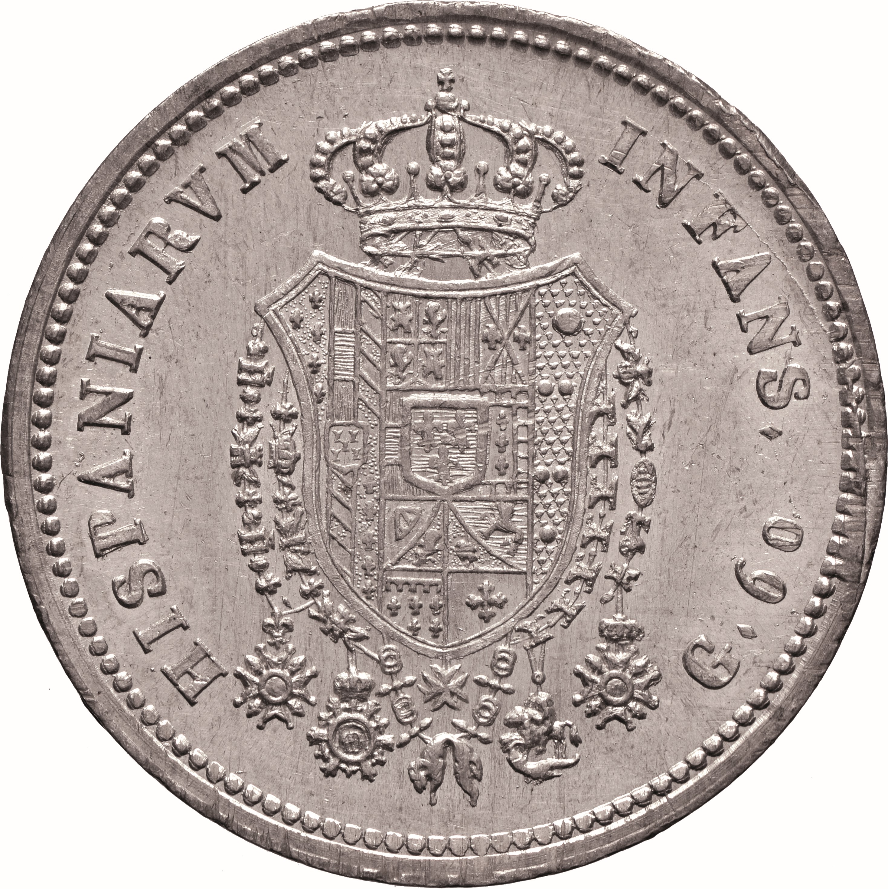 Dritto: Testa coronata del re volta a d., con lunghi capelli ricci; sotto, 1818. Campo monetale delimitato da cornice con filetto dentellato. Rovescio: Scudo sagomato in cartella semplice, coronato e cinto dai collari degli Ordini di 1) Spirito Santo, 2) san Gennaro, 3) Carlo III, 4) san Ferdinando e del merito, 5) Costantiniano di san Giorgio, 6) Toson d’oro, interzato in palo: nel 1°, troncato, in a) interzato in palo, di 1, Farnese, 2, Austria, 3, Borgogna Antica; in b), interzato in palo, di 1, vuoto, 2, Borgogna Antica, 3, Farnese; sul tutto, scudetto di Portogallo. Nel 2°, interzato in fascia, in a), partito, 1), inquartato di Castiglia e León, 2), contropartito di Aragona e di Sicilia; in b), partito di Austria e Borgogna Moderna; in c), inquartato, 1) tagliato di Borgogna Antica e Fiandre, 2) trinciato di Tirolo e Brabante, 3) di Angiò, 4) di Gerusalemme; nel 3°, di Medici; nel centro, scudetto di Borbone. Nel campo, a destra, contro l’orlo, G♦ 60♦. Campo monetale delimitato da cornice con filetto dentellato