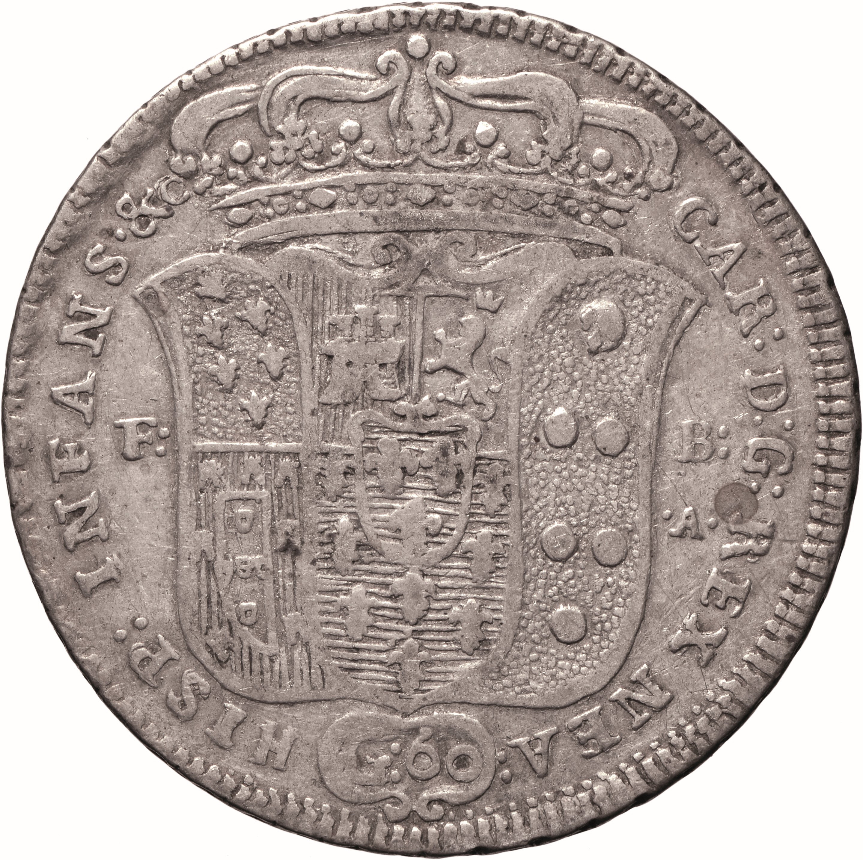Dritto: Il Sebeto sdraiato sulla riva del mare, con braccio destro adagiato su di un’urna da cui scorre acqua e nella mano sinistra un badile; dietro, un pino, e sullo sfondo, il Vesuvio. In esergo: De 1736 ∙ G:. Campo monetale delimitato da filetto dentellato. Rovescio: Scudo coronato in cartella, interzato in palo: nel 1°, troncato dei Farnese e di Portogallo; nel 2°, troncato: in a), partito di Castiglia e León, in b), di Angiò; nel 3°, dei Medici. Sul tutto, scudetto dei Borbone. Nel campo, ai lati, F: / B: | ·A·; sotto lo scudo, in cartella, G: 60. Campo monetale delimitato da filetto dentellato