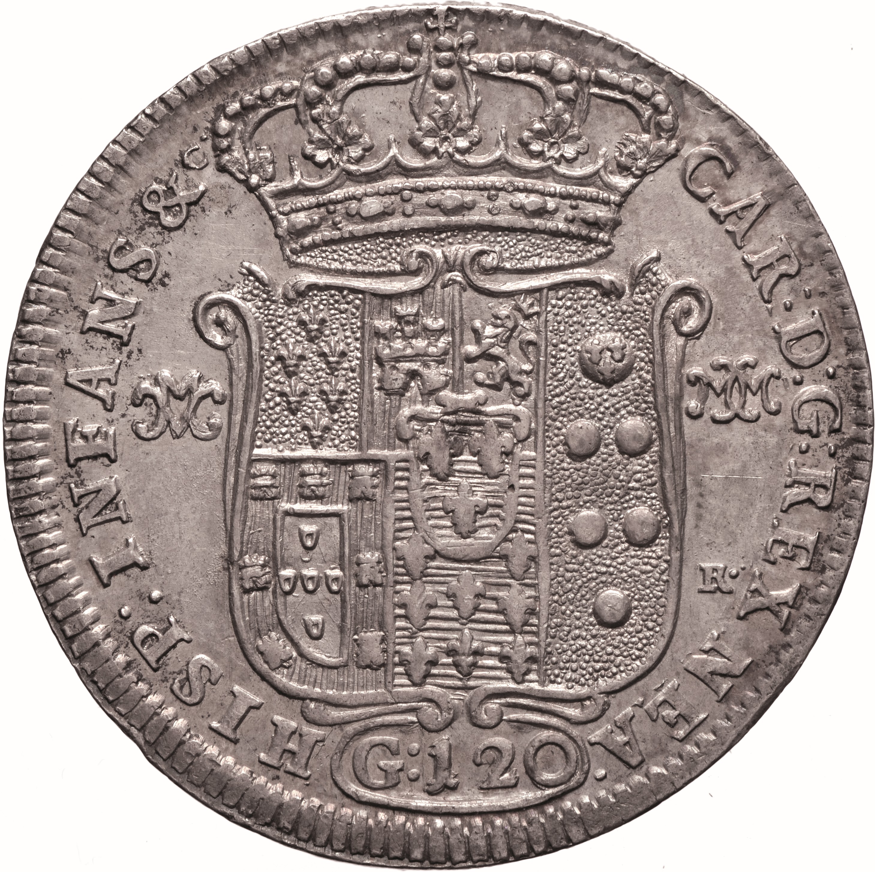 Dritto: Il Sebeto sdraiato sulla riva del mare, con braccio destro adagiato su di un’urna da cui scorre acqua e nella mano sinistra un badile; dietro, un pino, e sullo sfondo, il Vesuvio. In esergo: D’ 1748 · G:. Campo monetale delimitato da filetto dentellato. Rovescio: Scudo coronato in cartella, troncato: nel 1°, interzato in palo di Farnese, Castiglia e León; nel 2°, partito di Portogallo e Angiò; sinistrato di Medici. Sul tutto, nel centro, scudetto dei Borbone. Ai lati V͜ M / M͜ M; in basso a d., R·; sotto, in cartella, G: 120. Campo monetale delimitato da filetto dentellato