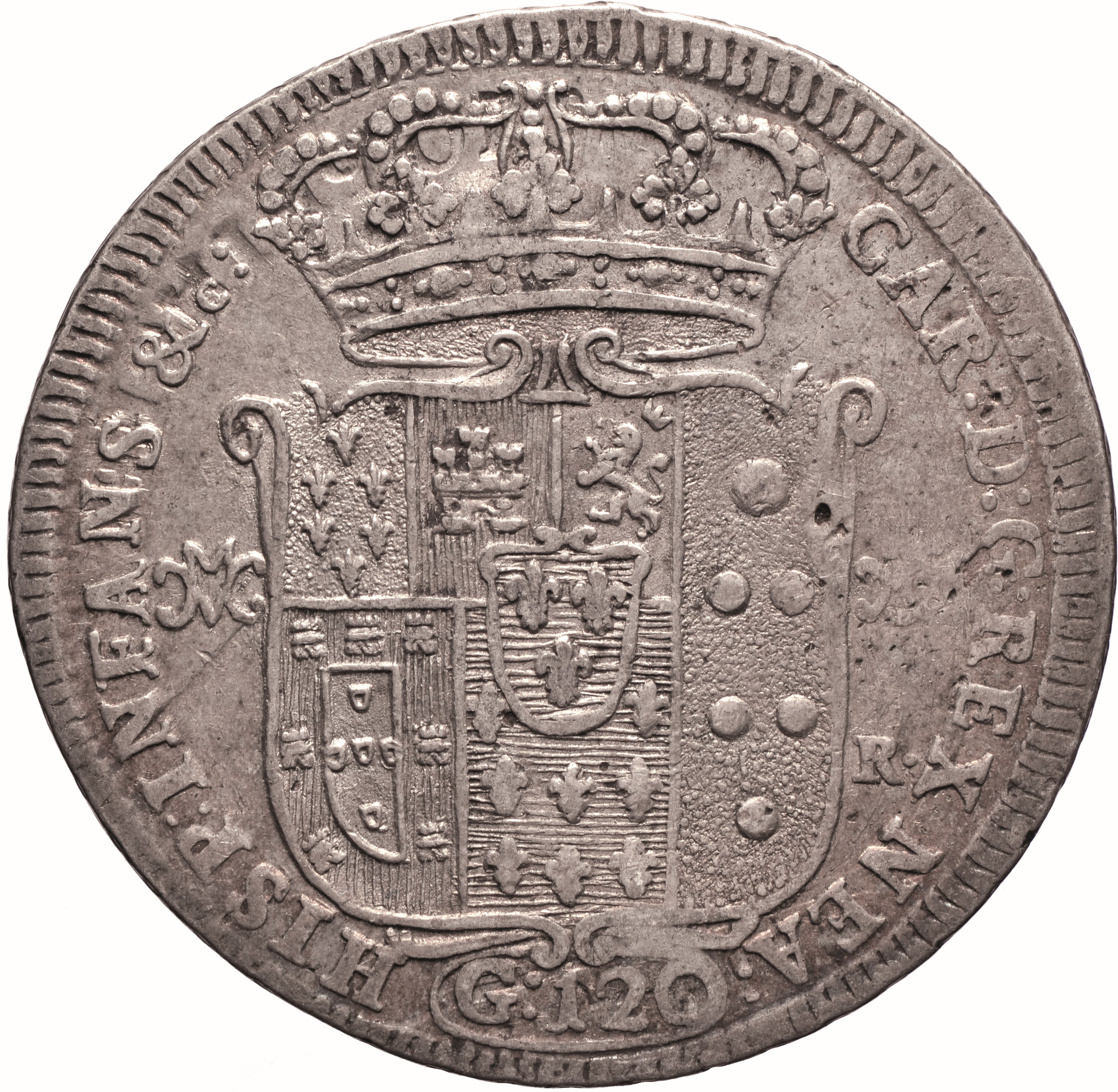 Dritto: Il Sebeto sdraiato sulla riva del mare, con braccio destro adagiato su di un’urna da cui scorre acqua e nella mano sinistra un badile; dietro, un pino, e sullo sfondo, il Vesuvio. In esergo, D’ 1749 G:. Campo monetale delimitato da filetto dentellato. Rovescio: Scudo coronato in cartella, troncato: nel 1°, interzato in palo di Farnese, Castiglia e León; nel 2°, partito di Portogallo e Angiò; sinistrato di Medici. Sul tutto, nel centro, scudetto dei Borbone. Ai lati V͜ M / M͜ M; in basso a d., R·; sotto, in cartella, G: 120. Campo monetale delimitato da filetto dentellato